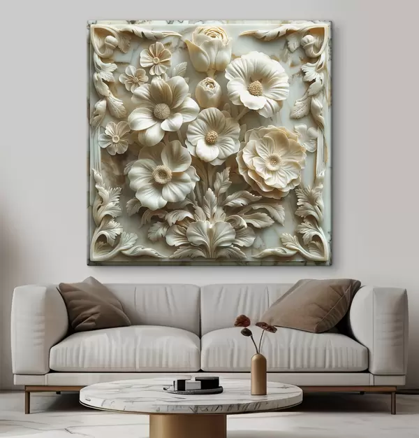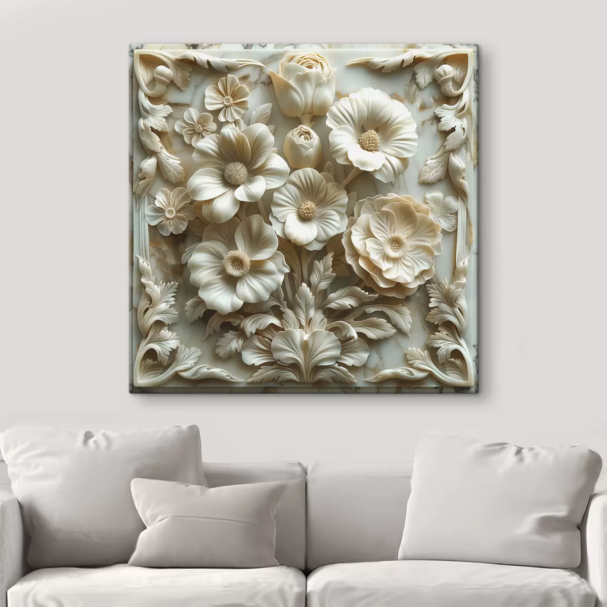 Glezna 3D balti bareljefa ziedi uz marmora fona ar rāmi Nr s39739