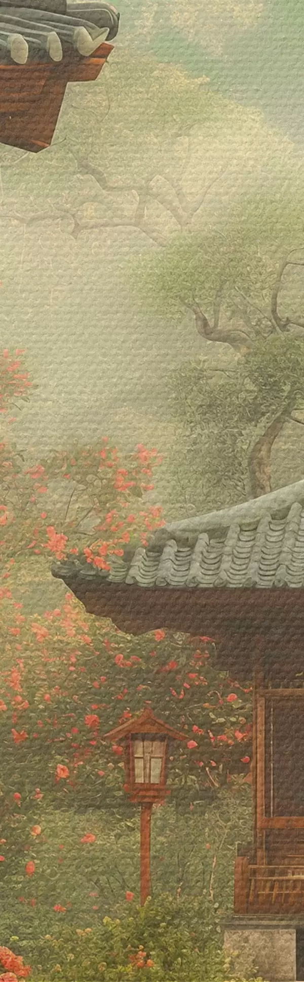 Glezna Japāņu parks ar ziedošiem kokiem un ziediem, mežs, koka māja s39773