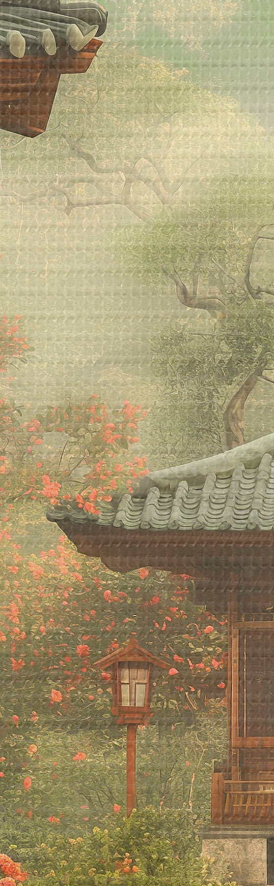 Glezna Japāņu parks ar ziedošiem kokiem un ziediem, mežs, koka māja Nr s39773