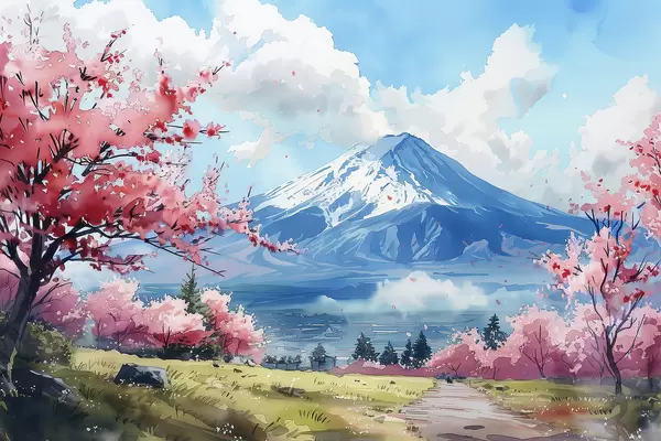 Glezna Fudži kalnu ainava, pavasarī ziedoša daba, ķiršu koki, japāņu valoda Nr s39777