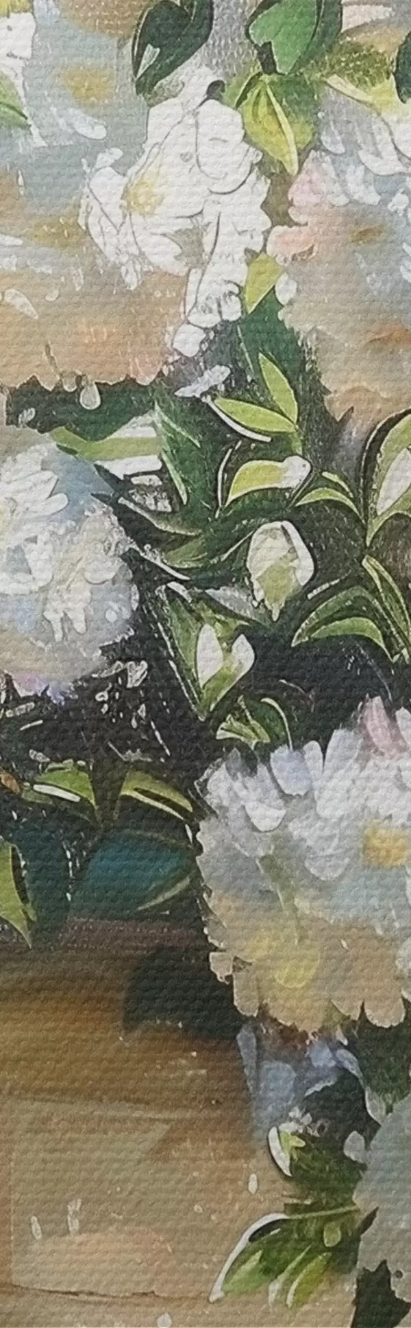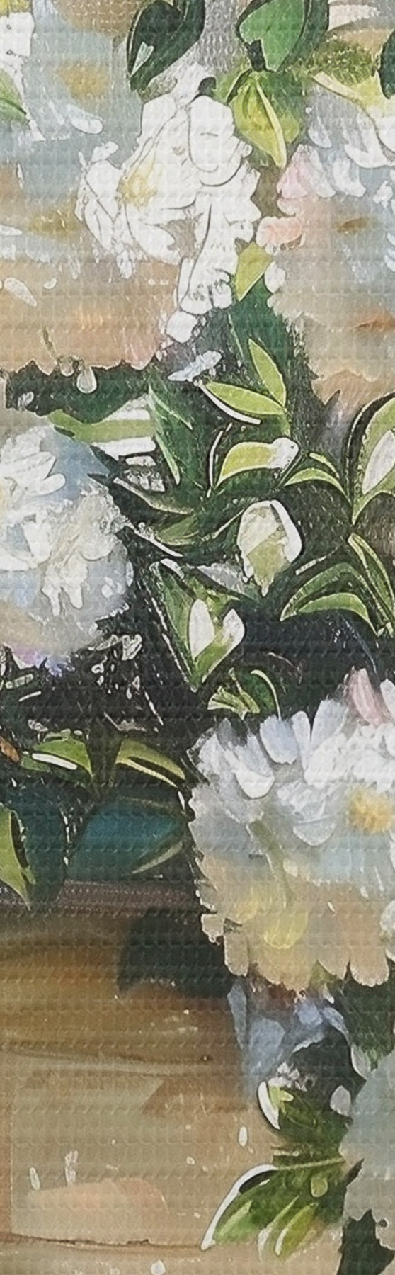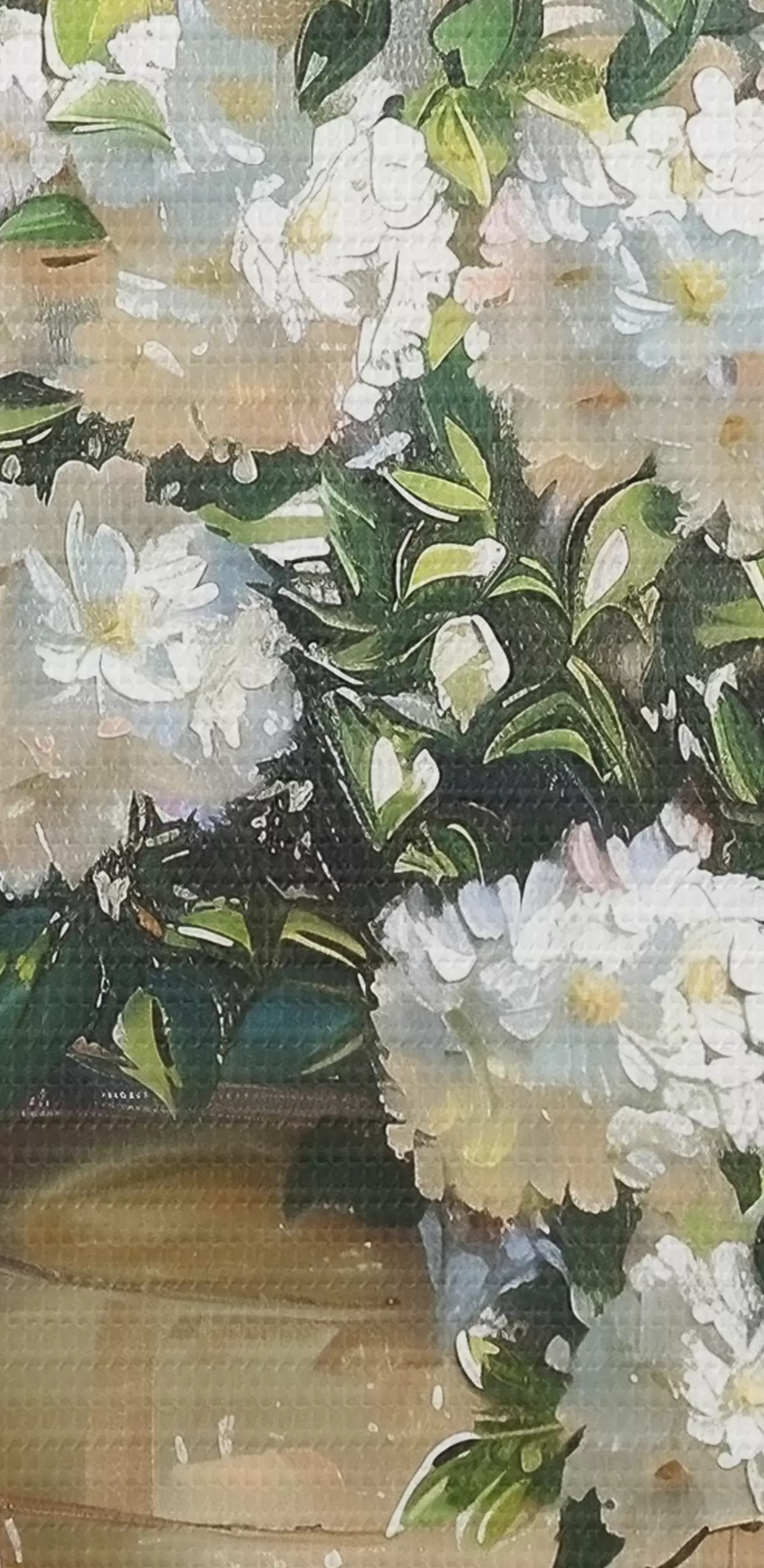 Glezna Baltas hortenzijas vāzē, saules gaisma logā, eļļas glezna Nr s39779