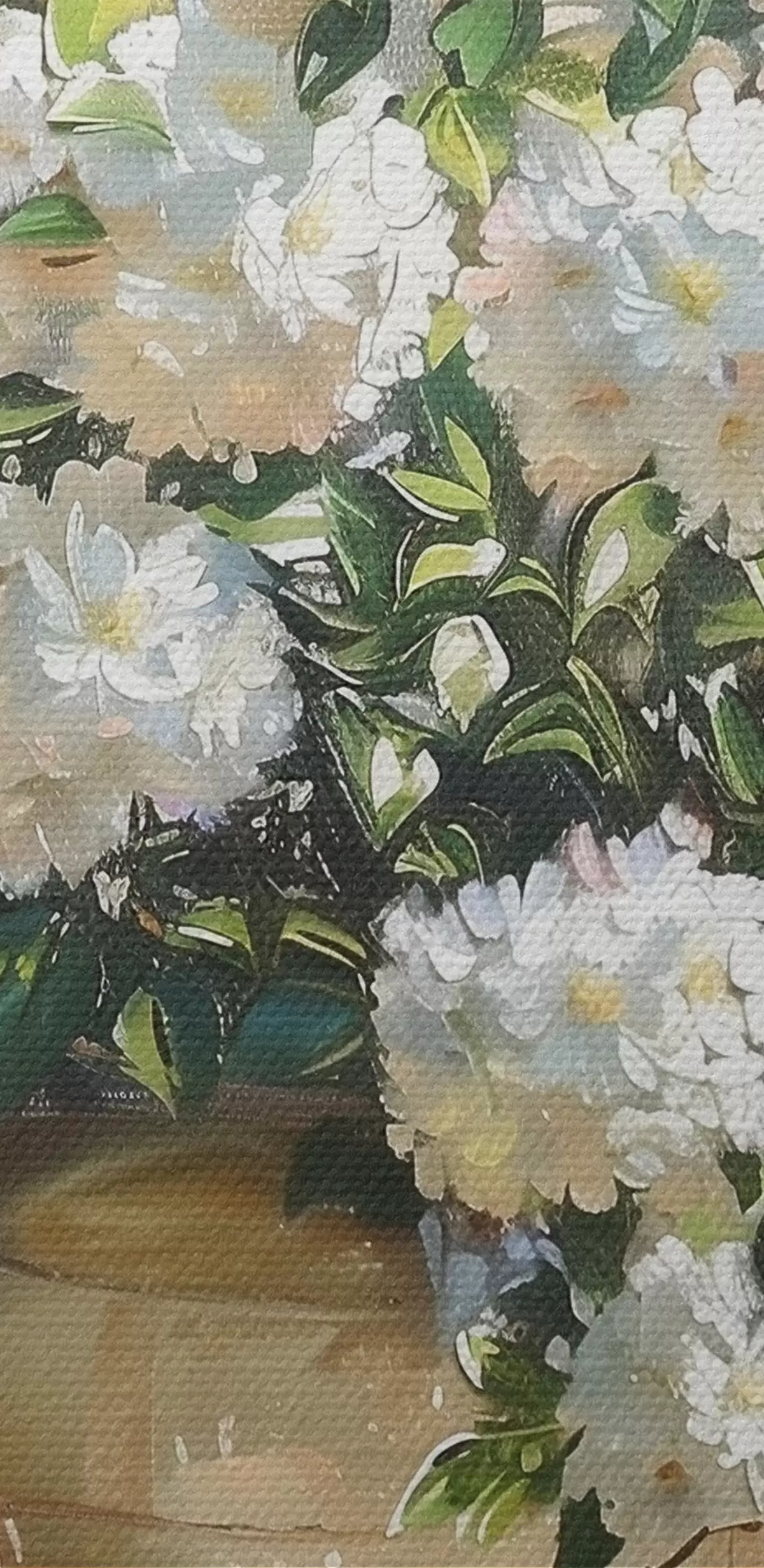 Glezna Baltas hortenzijas vāzē, saules gaisma logā, eļļas glezna s39779