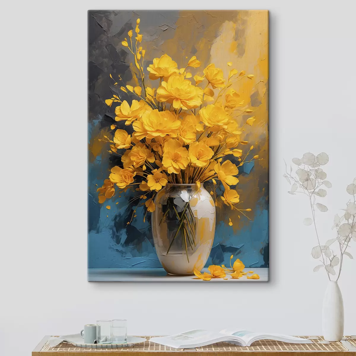 Glezna Dzelteni ziedi vāzē uz daudzkrāsaina akrila fona Nr s39854
