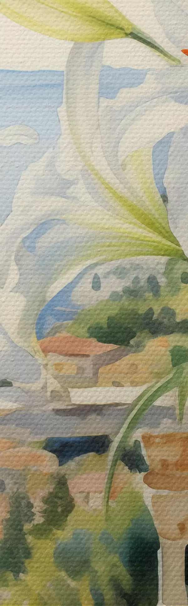 Glezna Baltas lilijas podiņā uz balkona uz līča akvareļa fona s39932