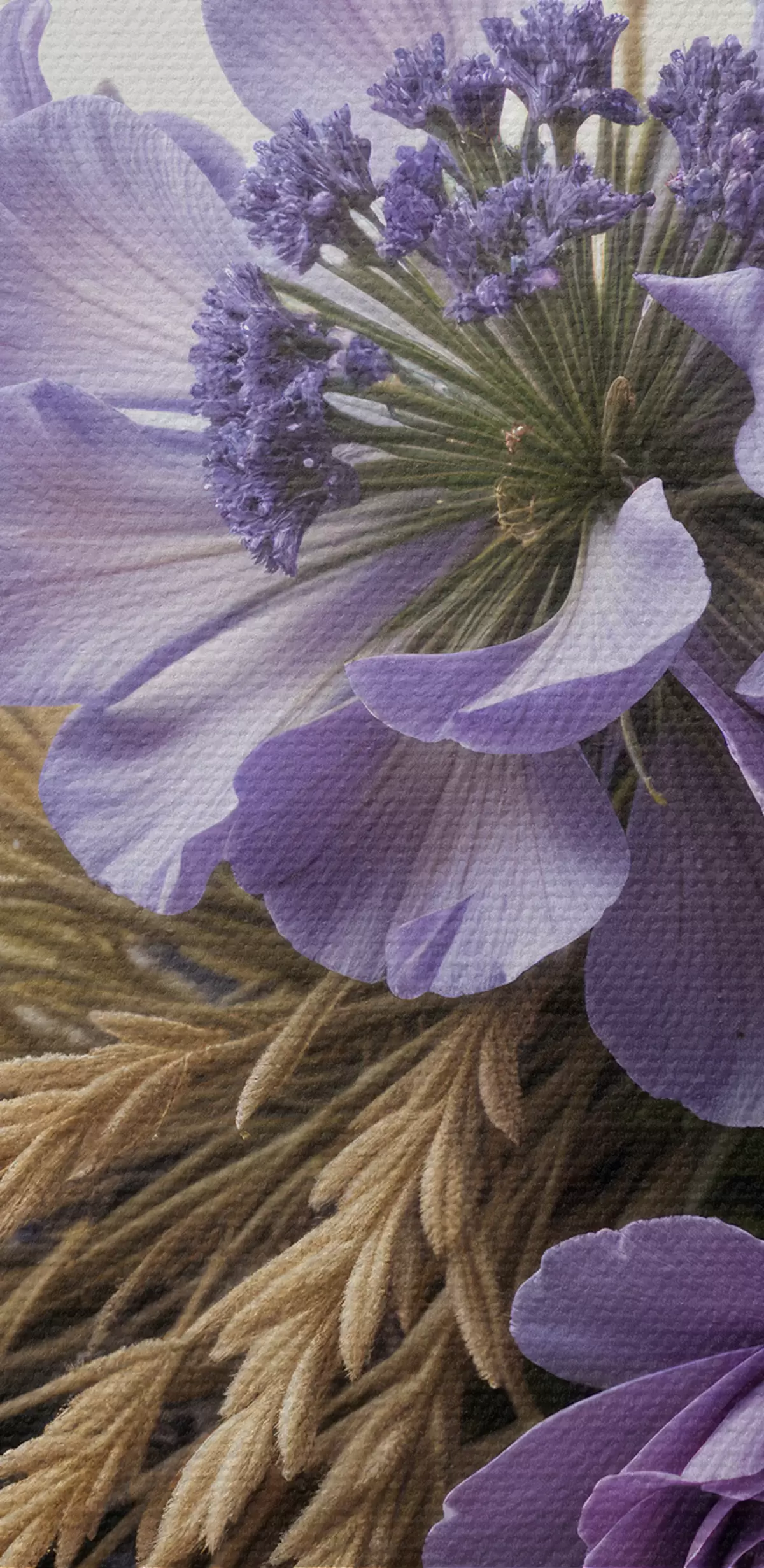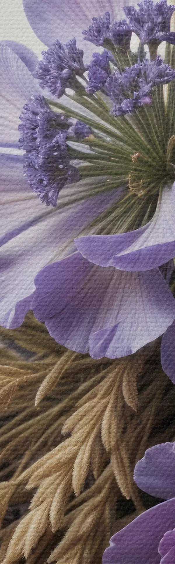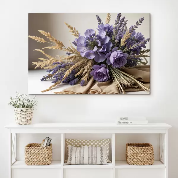 Glezna Violetu ziedu pušķis, ieskaitot peonijas un lavandu, ar kviešu kātiem uz gaiša fona Nr s40030