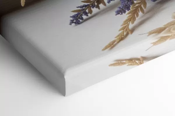 Glezna Violetu ziedu pušķis, ieskaitot peonijas un lavandu, ar kviešu kātiem uz gaiša fona s40030
