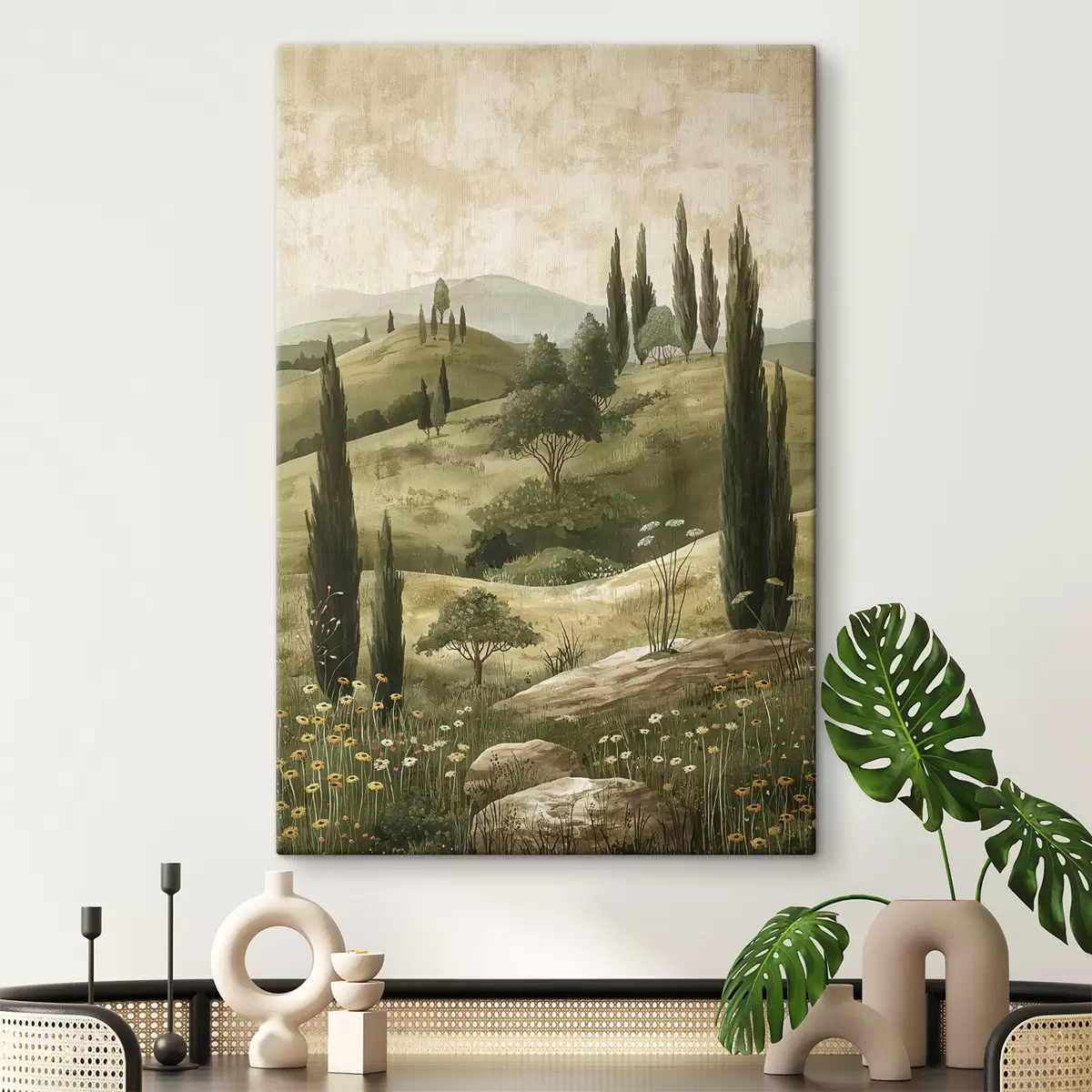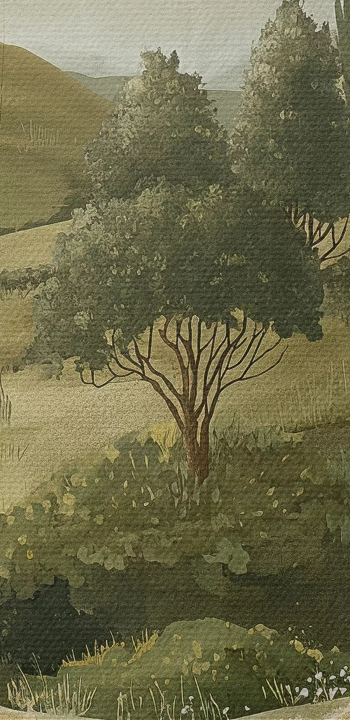 Glezna Vintage ainava, lauku stils, pasteļtoņi, pļava ar ziediem un kokiem Nr s40081