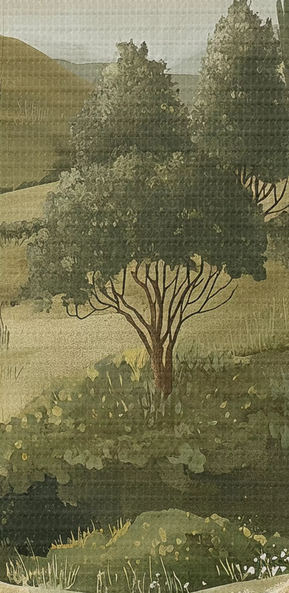 Glezna Vintage ainava, lauku stils, pasteļtoņi, pļava ar ziediem un kokiem s40081