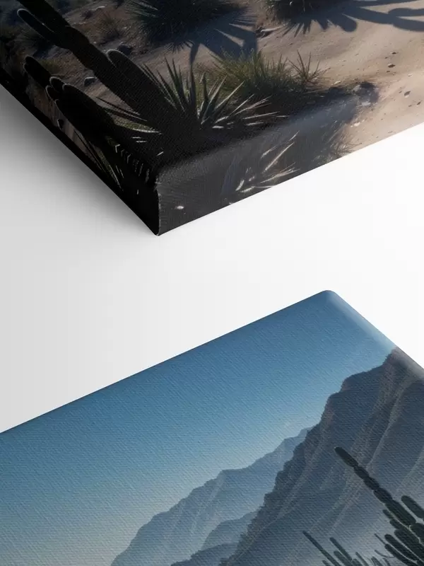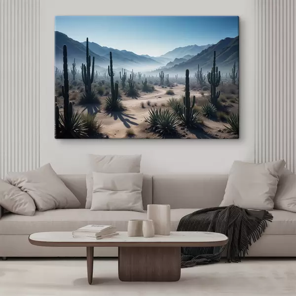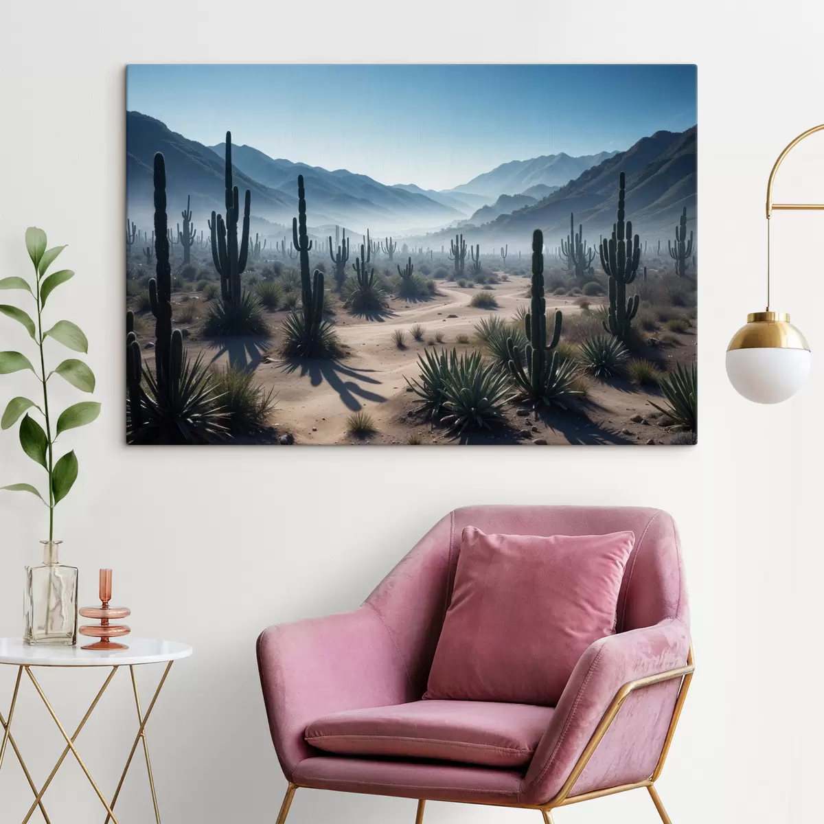 Glezna Tuksneša ainava ar augstiem kaktusiem un jukas augiem priekšplānā, ko ieskauj miglaini kalni Nr s40153
