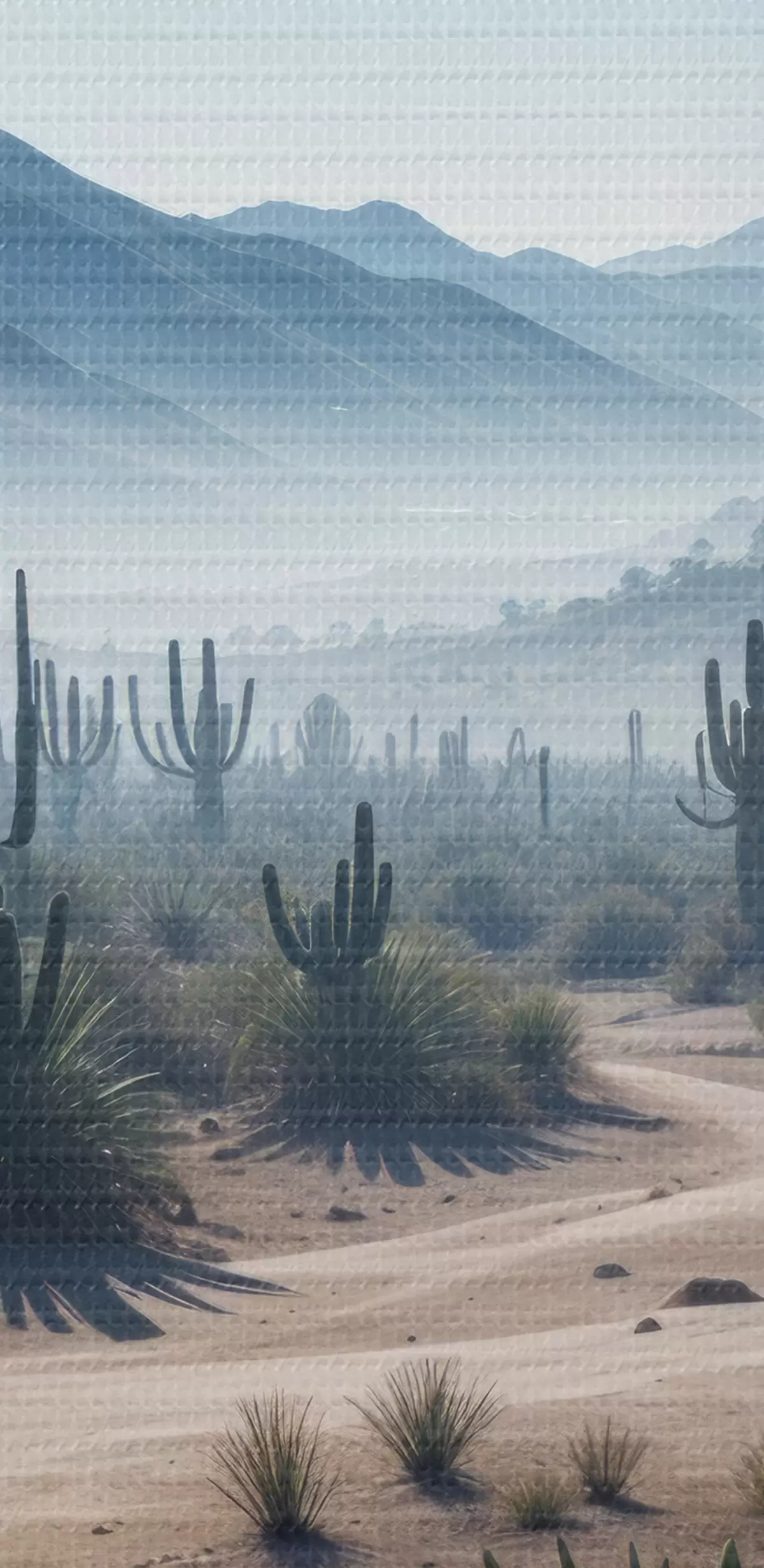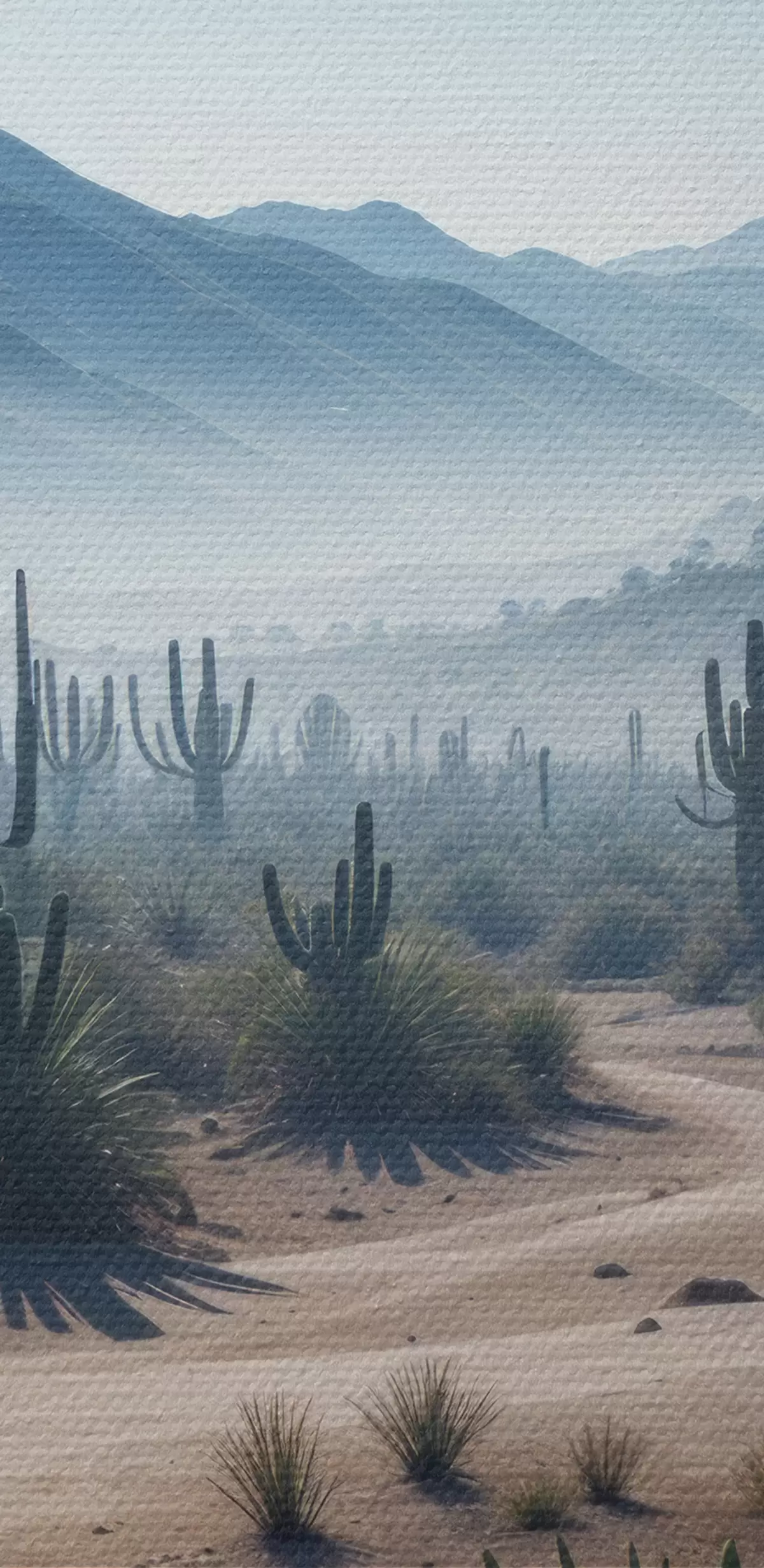 Glezna Tuksneša ainava ar augstiem kaktusiem un jukas augiem priekšplānā, ko ieskauj miglaini kalni s40153