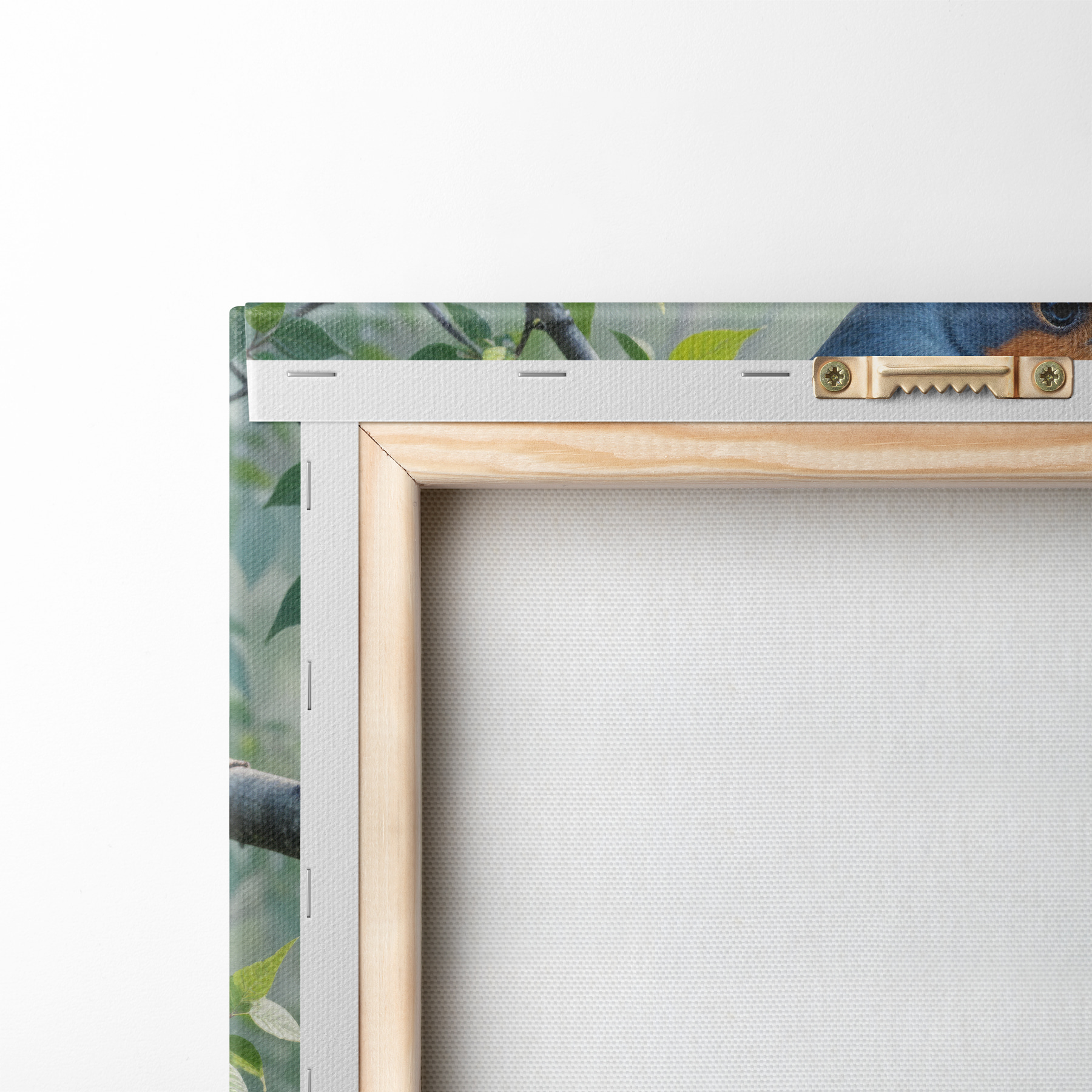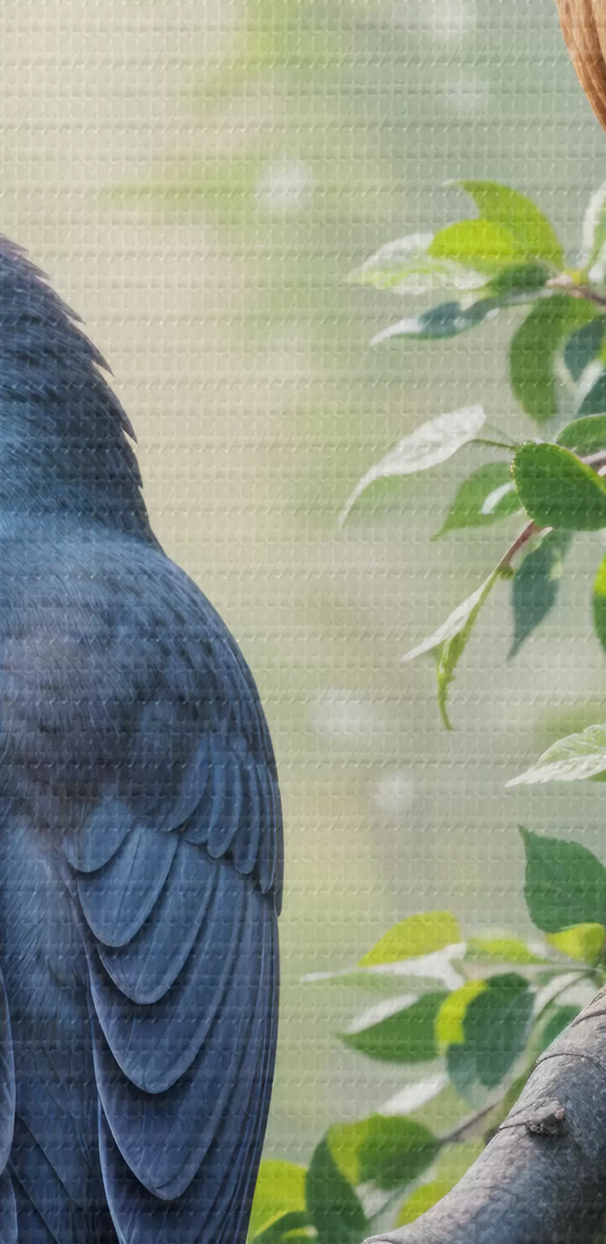 Glezna Divi zili un oranži putni, kas sēdēja uz koka zara ar zaļām lapām fonā Nr s40156