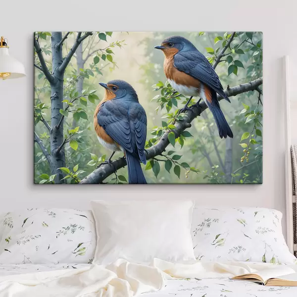 Glezna Divi zili un oranži putni, kas sēdēja uz koka zara ar zaļām lapām fonā Nr s40156