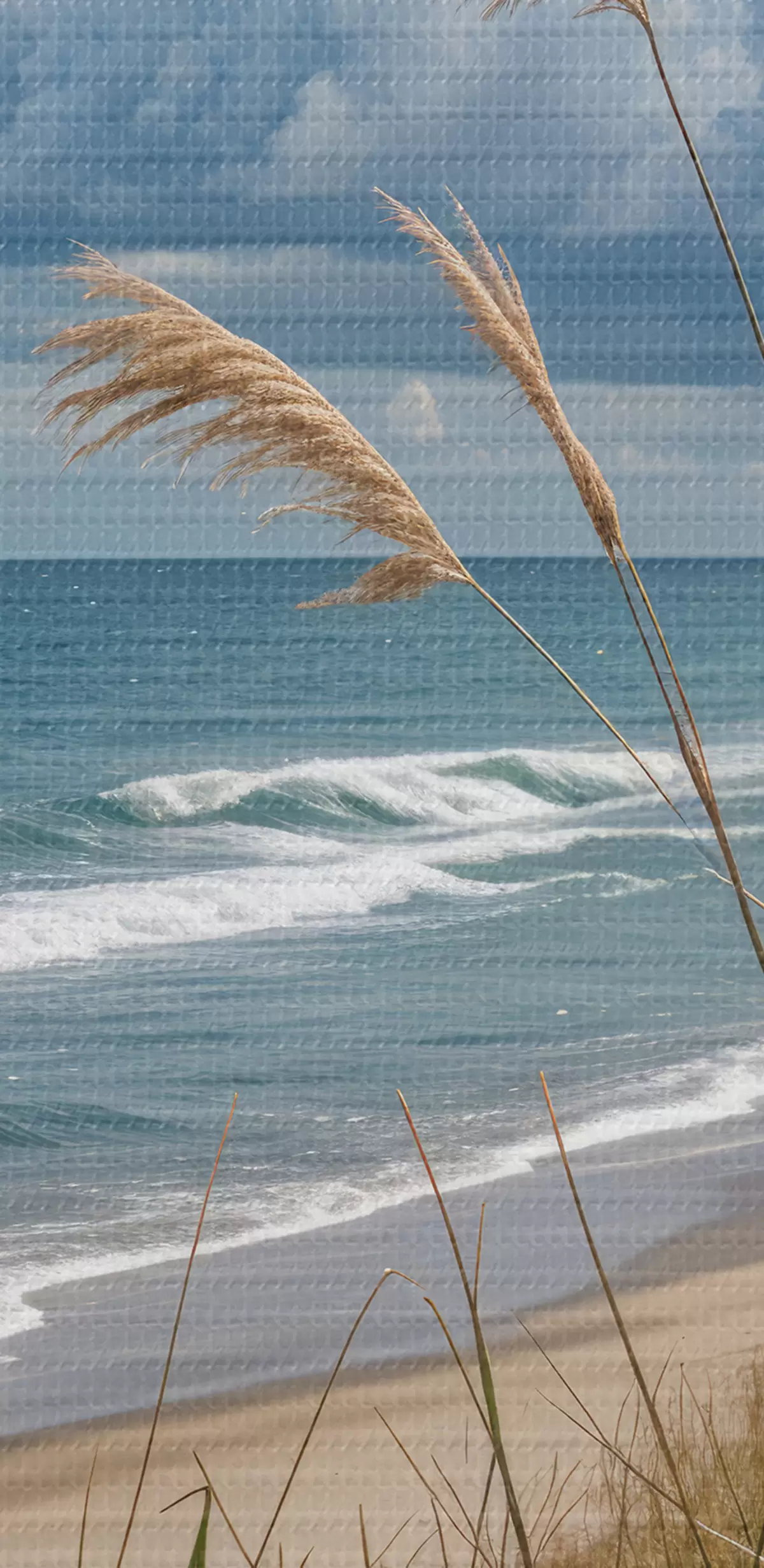 Glezna Gleznaina pludmale ar augstu zāli, kas šūpojas vējā, ar skatu uz okeānu ar kraukšķīgiem viļņiem un mākoņainām debesīm Nr s40161