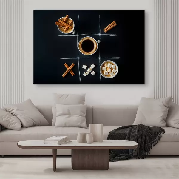 Glezna Tase kafijas ar kanēļa standziņām, cukura kubiņiem un zefīriem, kas sakārtoti tic-tac-toe režģī s40163