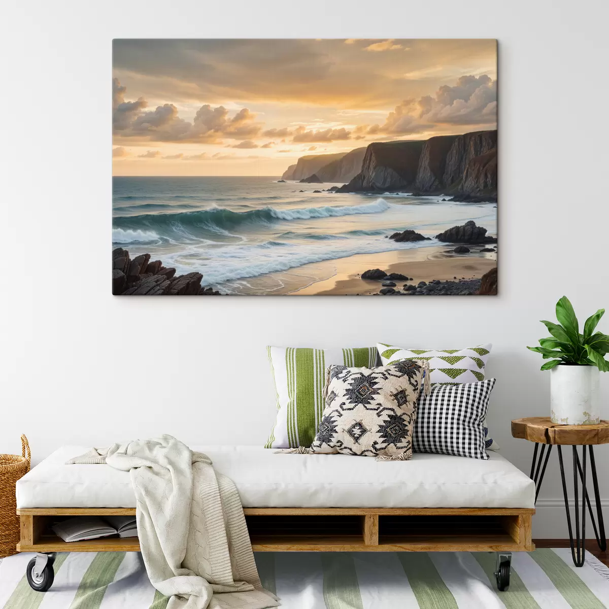 Glezna Gleznaina piekrastes ainava ar iespaidīgām klintīm, viļņiem un krāsainām saulrieta debesīm Nr s40176