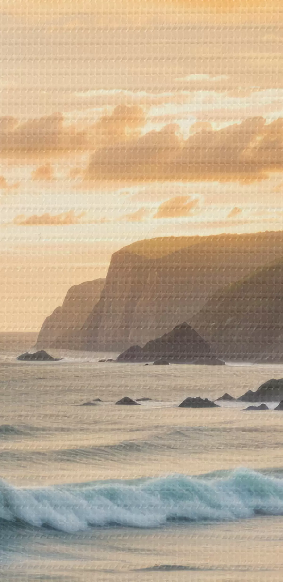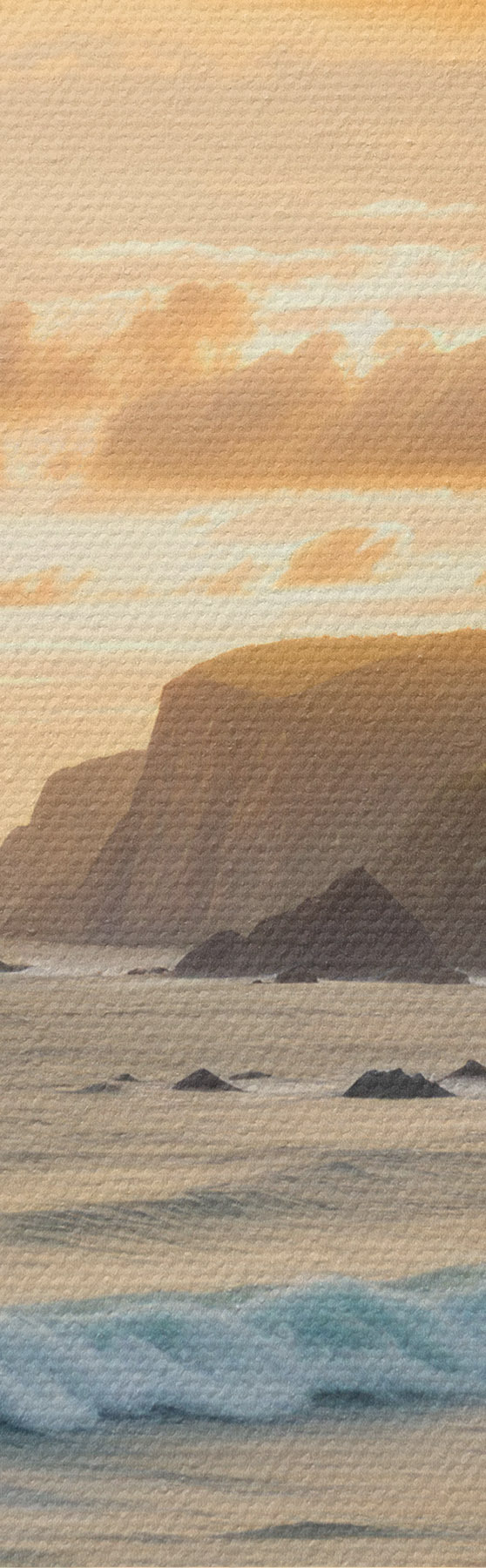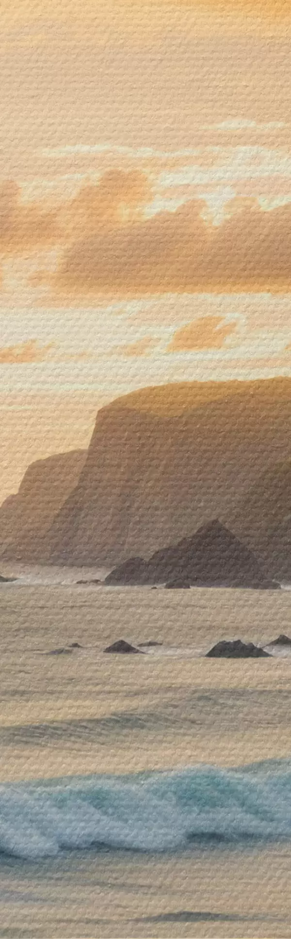 Glezna Gleznaina piekrastes ainava ar iespaidīgām klintīm, viļņiem un krāsainām saulrieta debesīm s40176