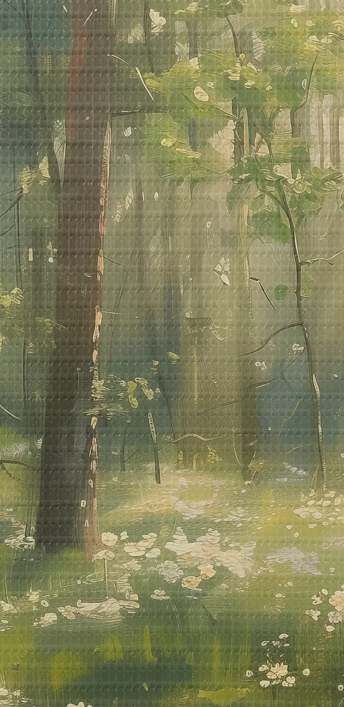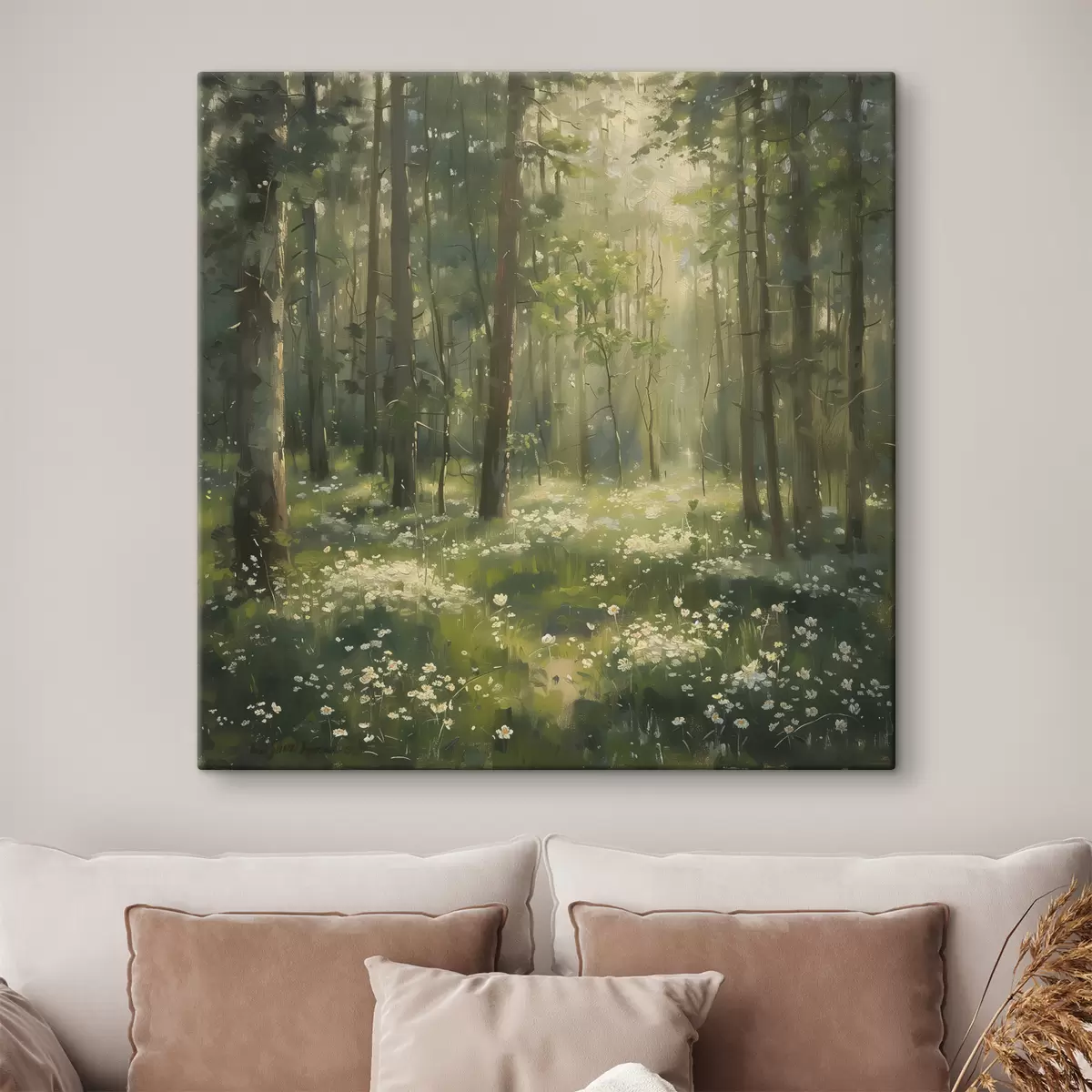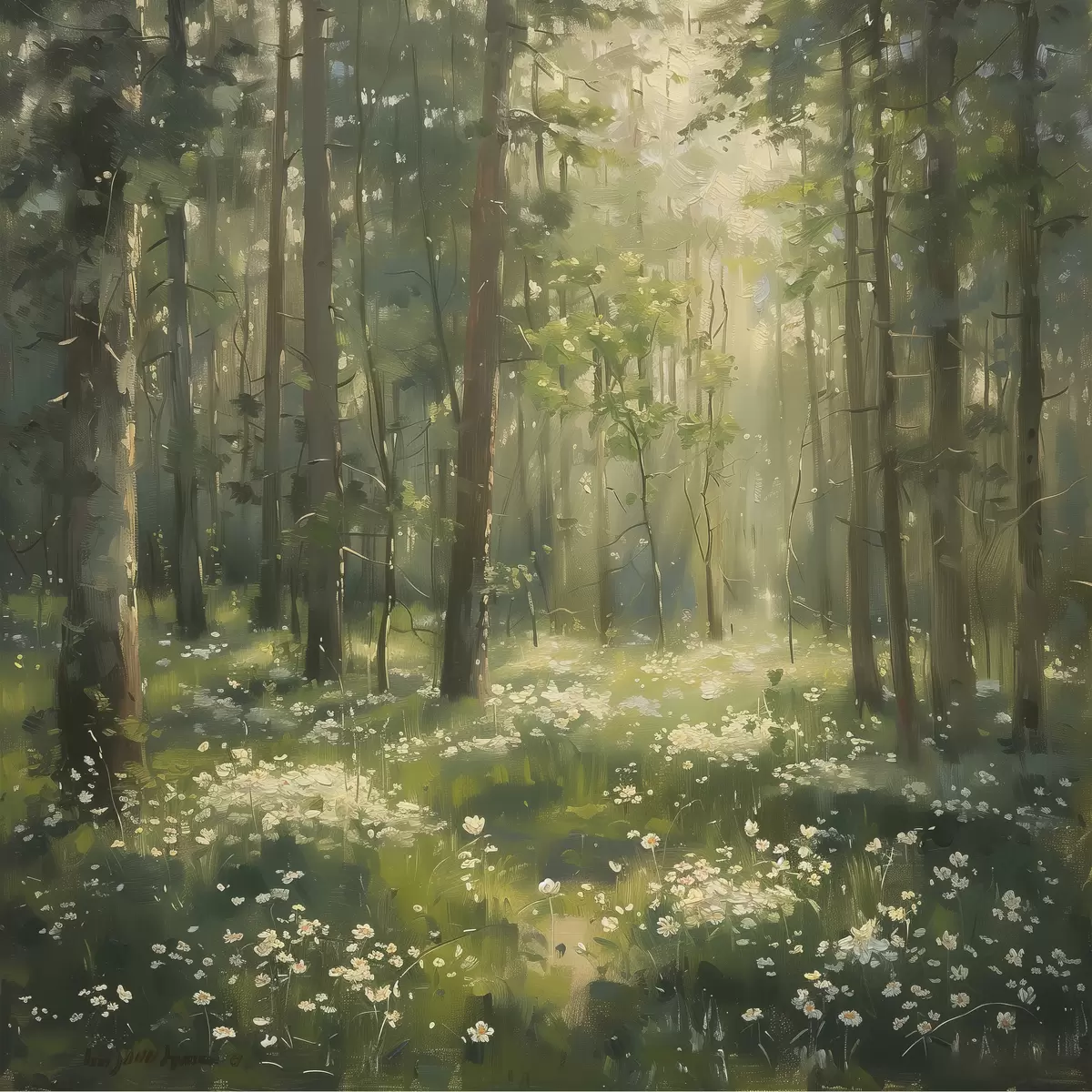 Glezna Mežs ar saules gaismu kokos, kumelīšu ziedi, zaļa zāle, akrila zīmējums Nr s40226