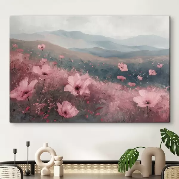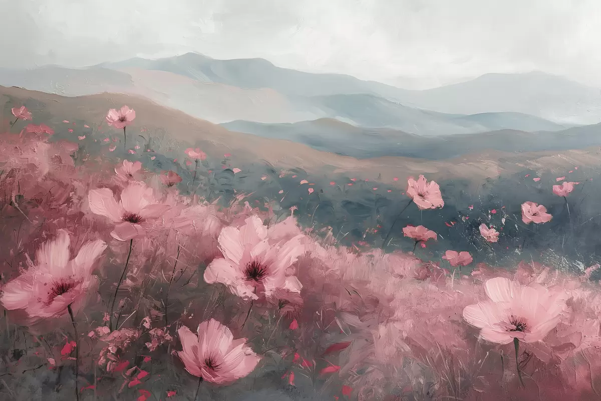 Glezna Rozā ziedi pļavā, dabas ainava, kalni, eļļas glezna, spilgti otas triepieni Nr s40233