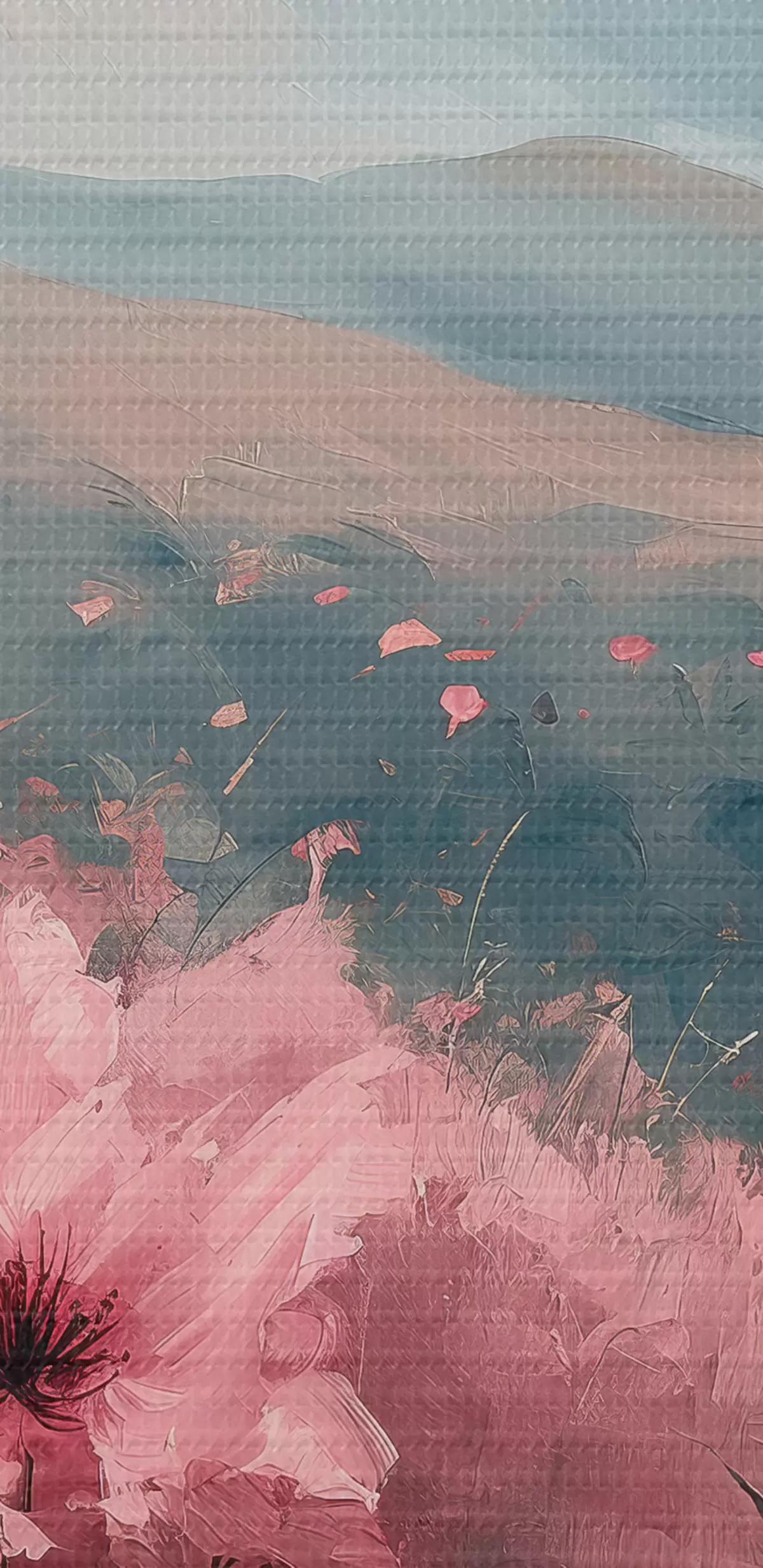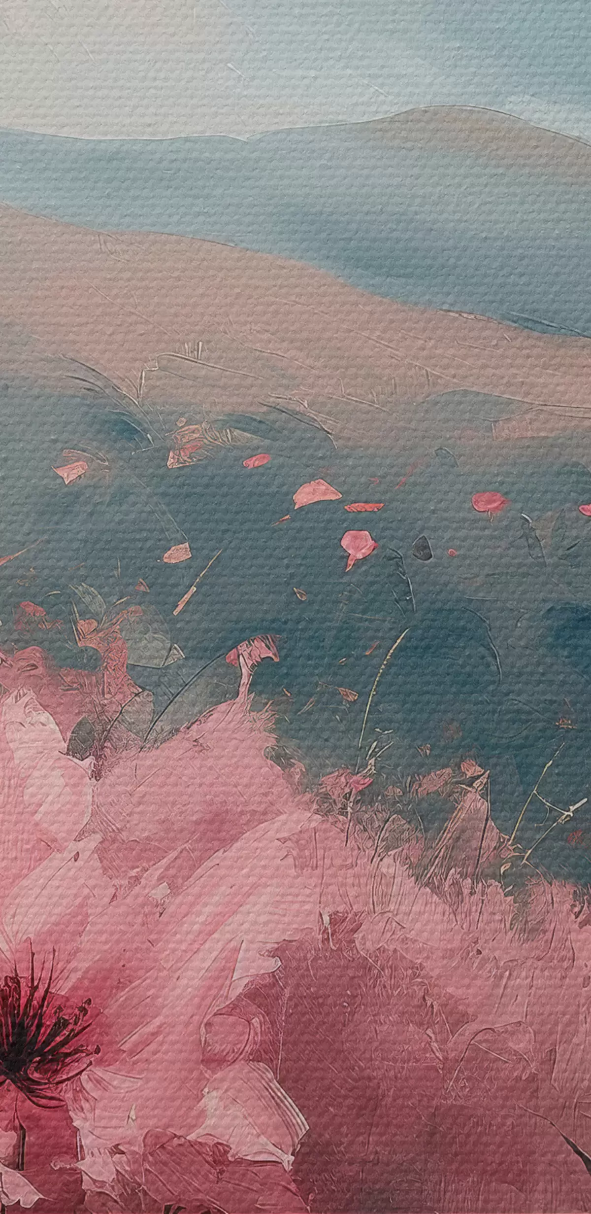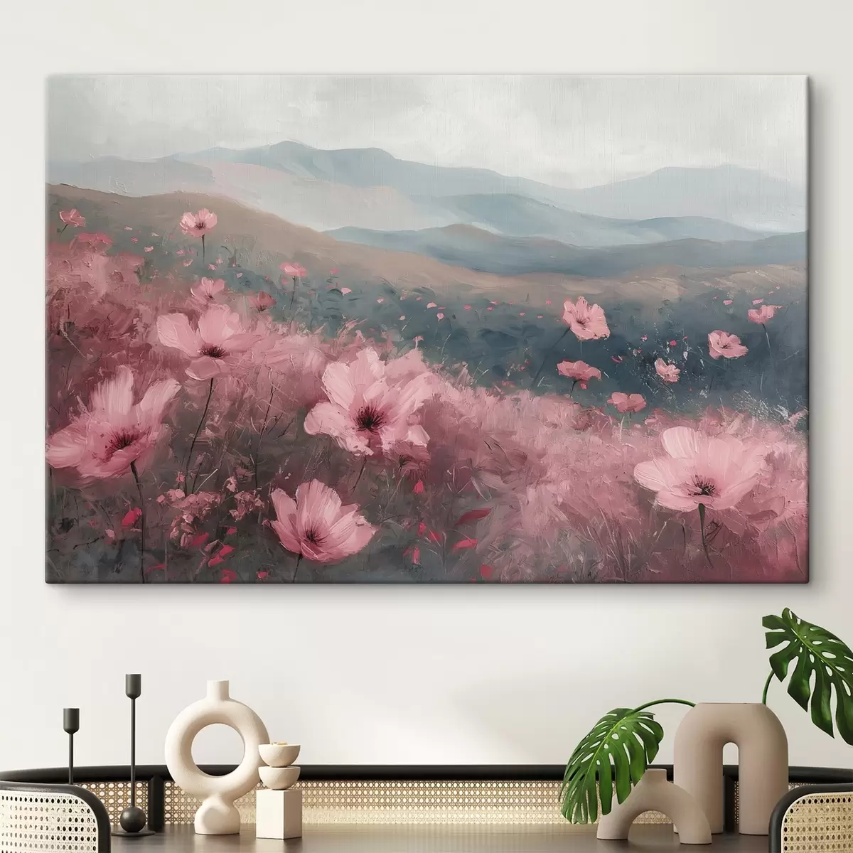 Glezna Rozā ziedi pļavā, dabas ainava, kalni, eļļas glezna, spilgti otas triepieni s40233