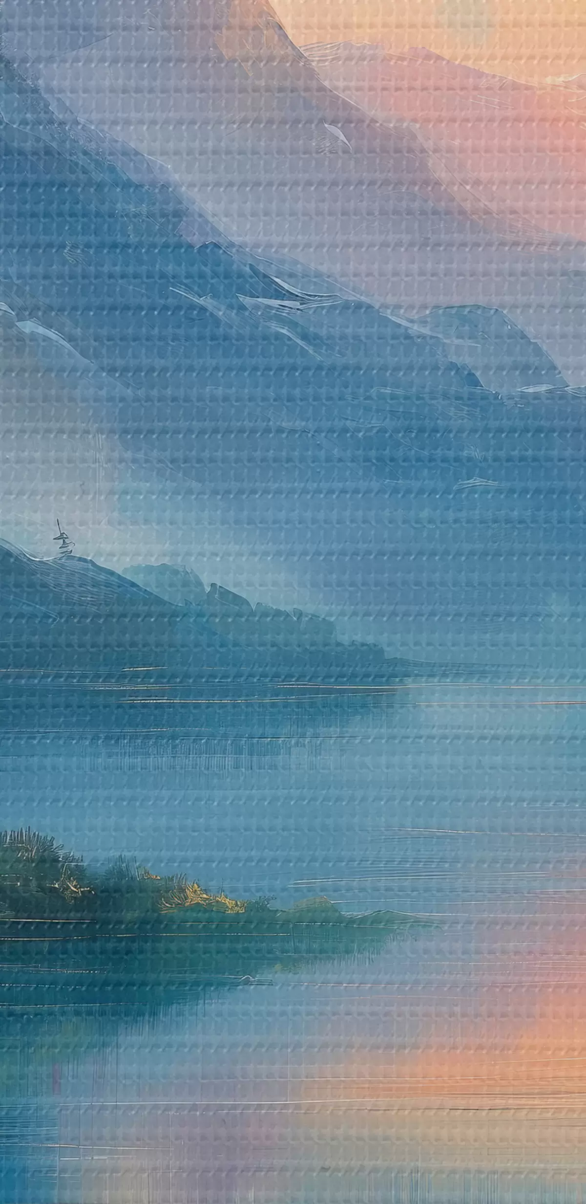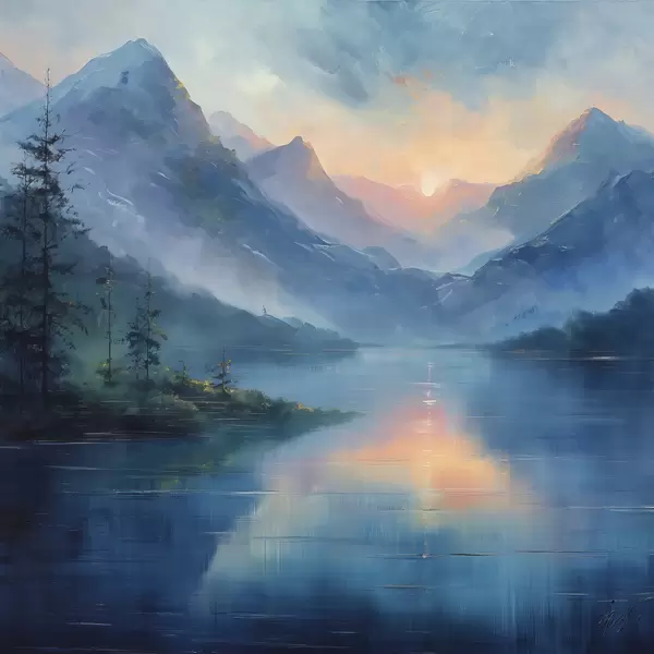 Glezna Saulriets kalnos, migla, upe, forēsta, eļļas glezna Nr s40302
