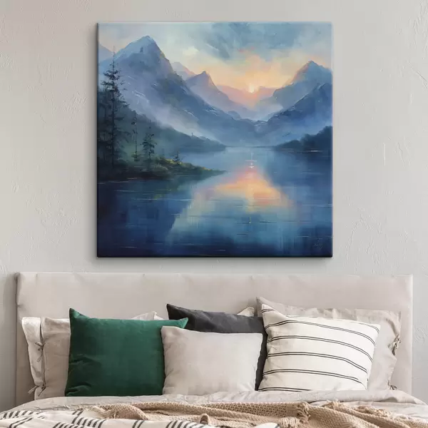 Glezna Saulriets kalnos, migla, upe, forēsta, eļļas glezna Nr s40302