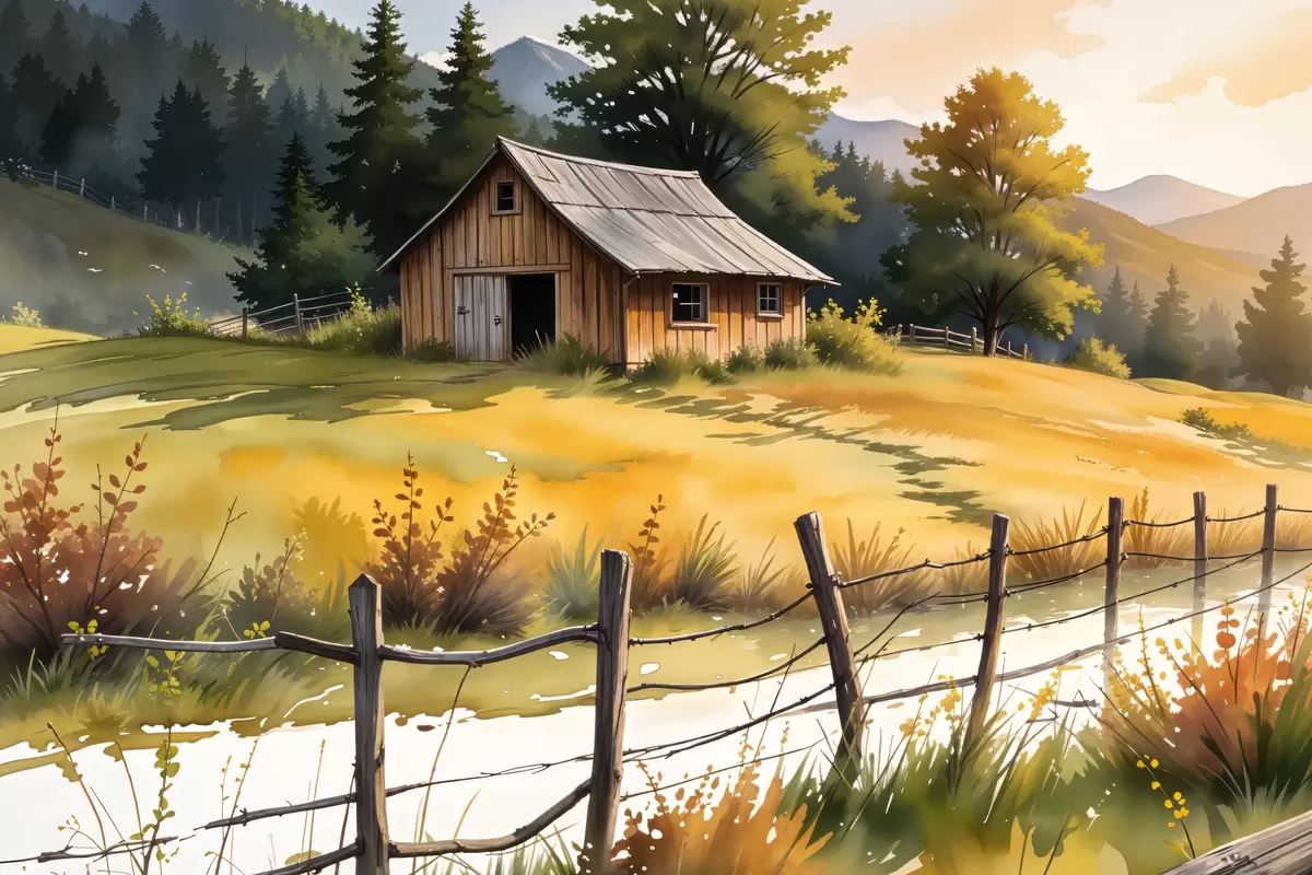 Glezna Veca koka māja lauku laukos, ko ieskauj zālains lauks, priedes un kalni s40394