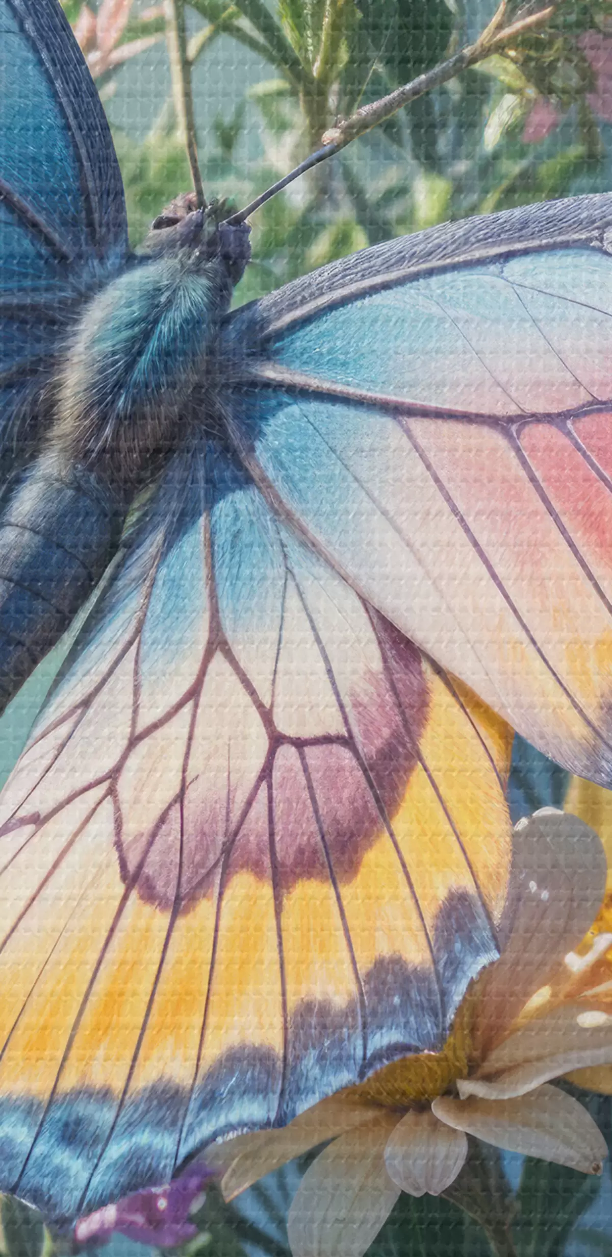 Glezna Liels, krāsains tauriņš, kas atrodas uz rozā un dzeltenu ziedu pušķa uz tumši zaļa fona Nr s40411