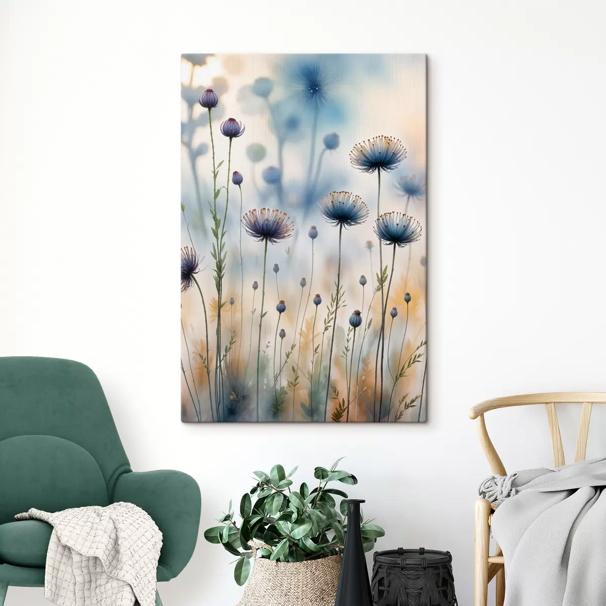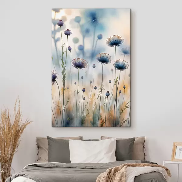 Glezna Augsti purpursarkani pienenei līdzīgi ziedi ar izplūdušu fonu, radot rāmu un sapņainu atmosfēru Nr s40414
