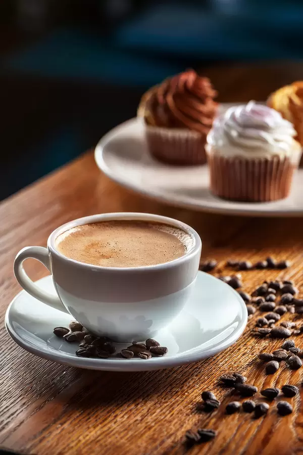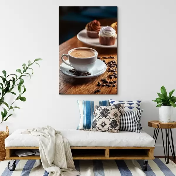 Glezna kafijas tase, kafijas pupiņas, kūkas, klusā daba Nr s40417