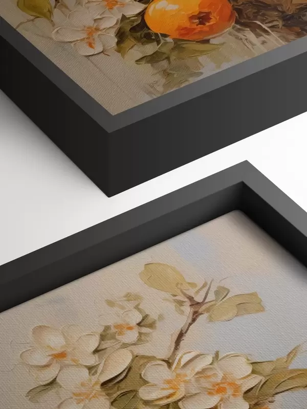 Glezna Zars ar baltiem ziediem un apelsīniem uz pelēki bēša fona s40486