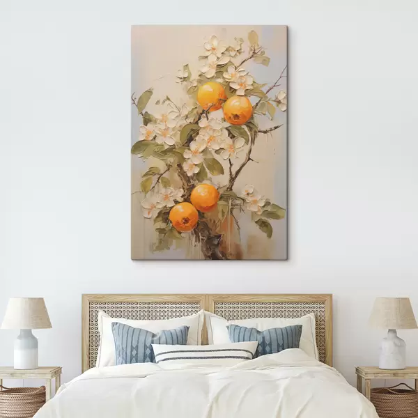 Glezna Zars ar baltiem ziediem un apelsīniem uz pelēki bēša fona s40486