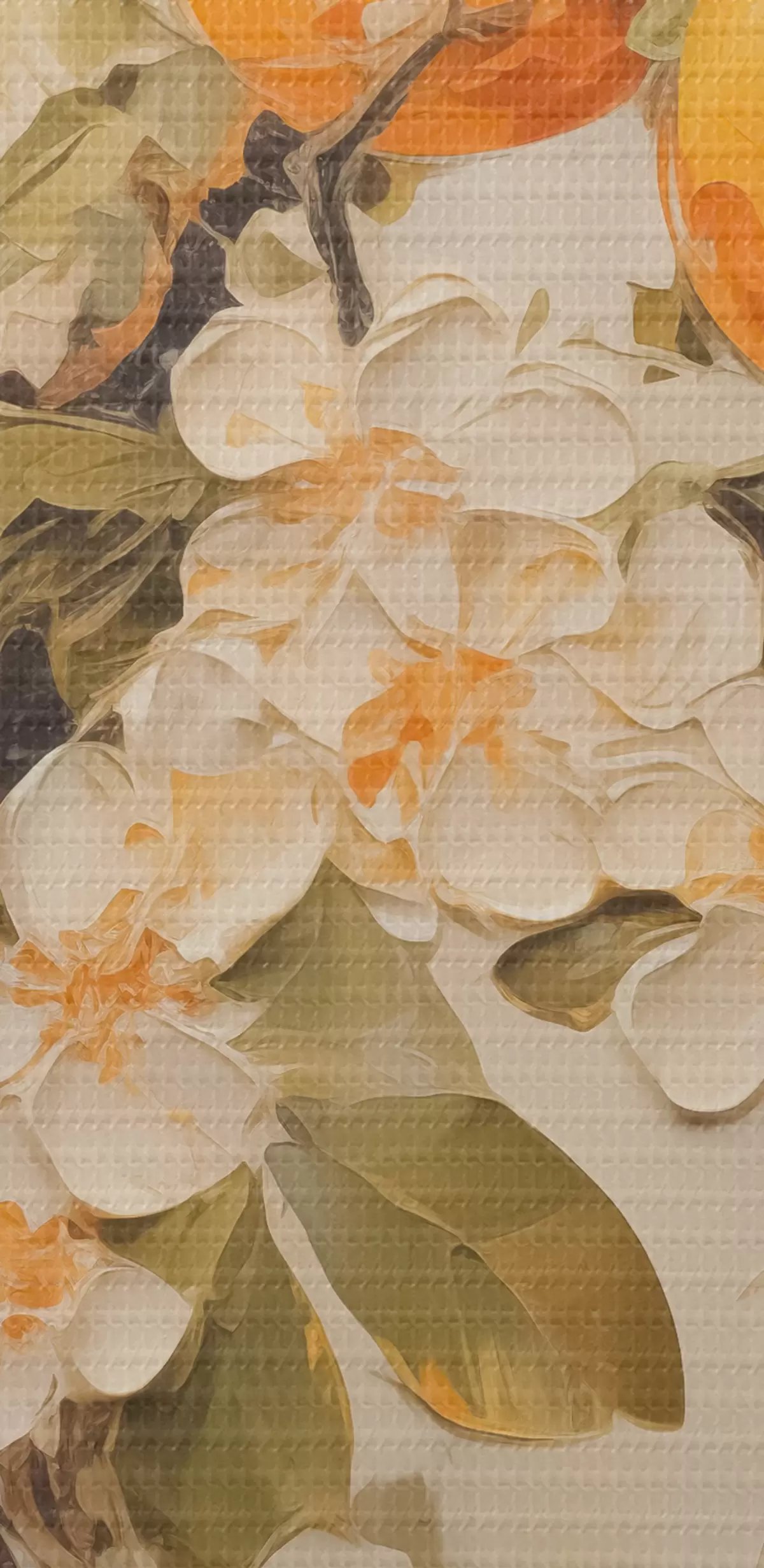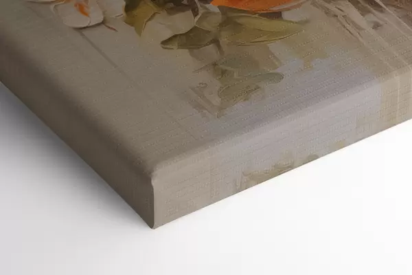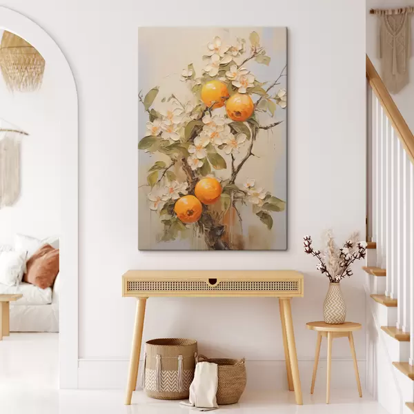 Glezna Zars ar baltiem ziediem un apelsīniem uz pelēki bēša fona s40486