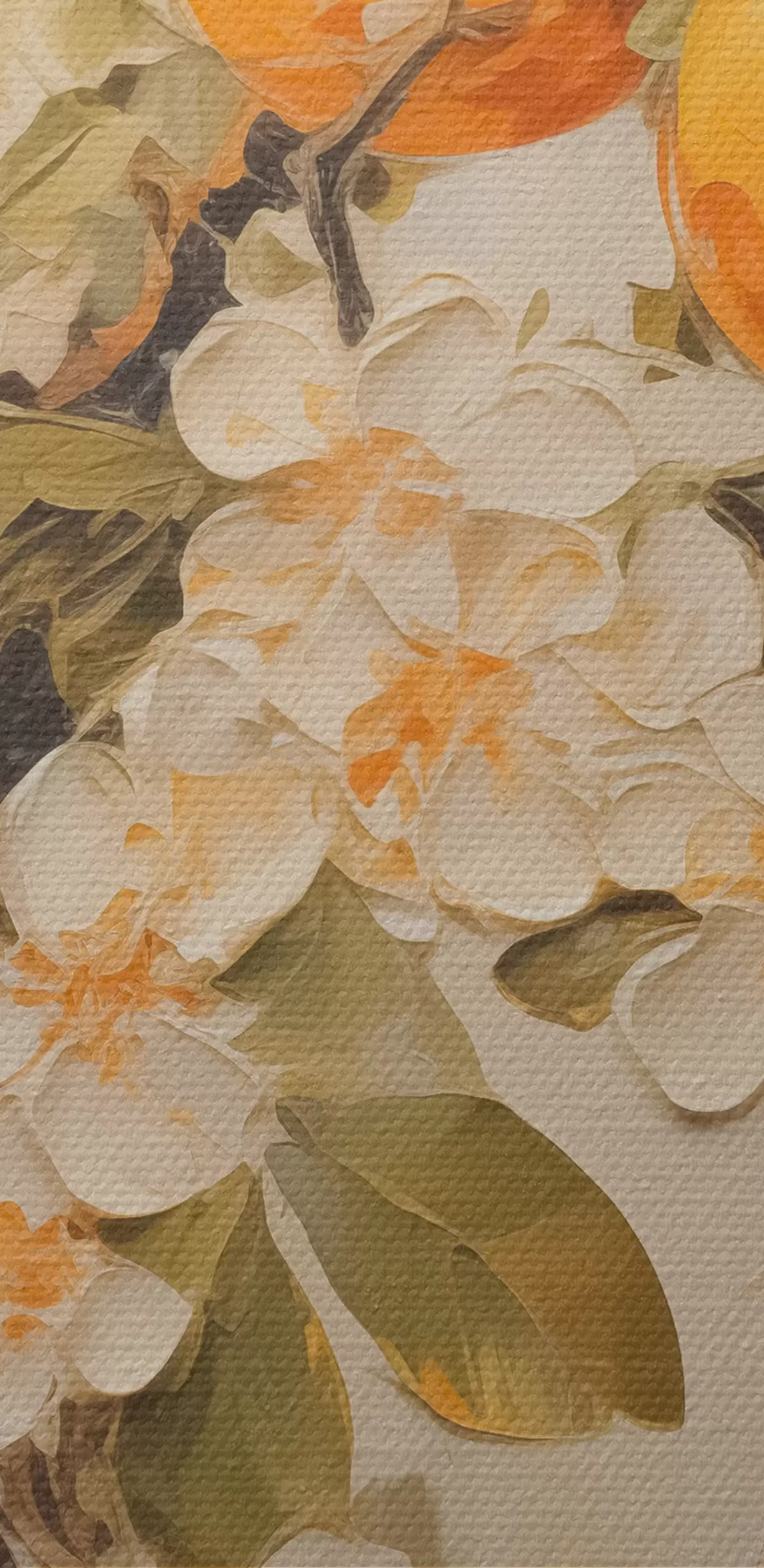 Glezna Zars ar baltiem ziediem un apelsīniem uz pelēki bēša fona Nr s40486