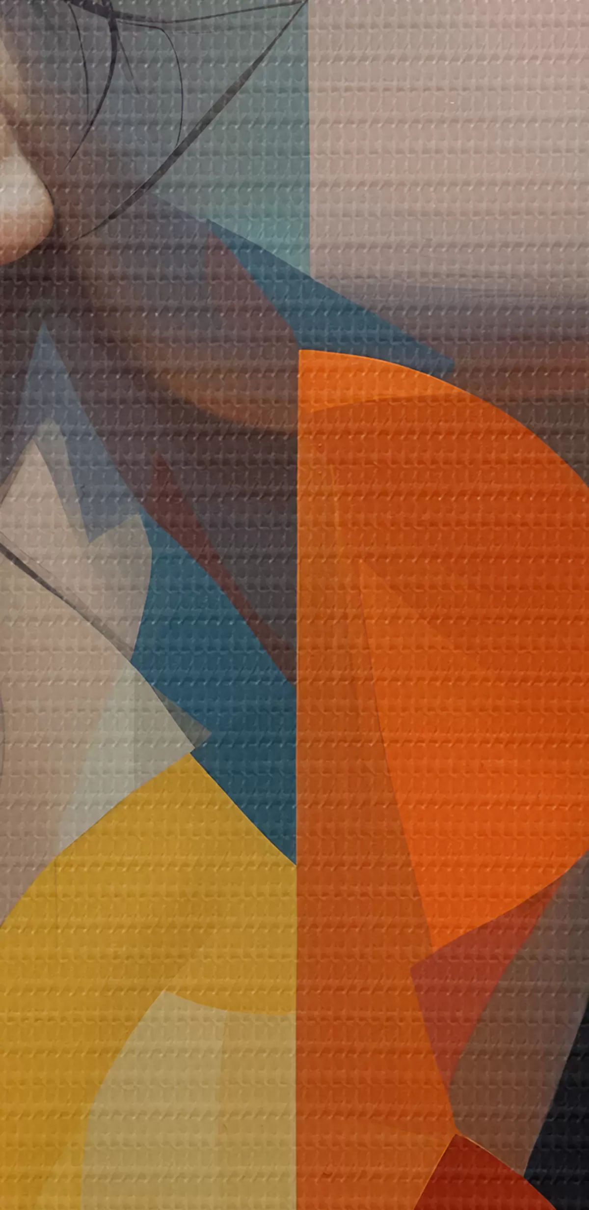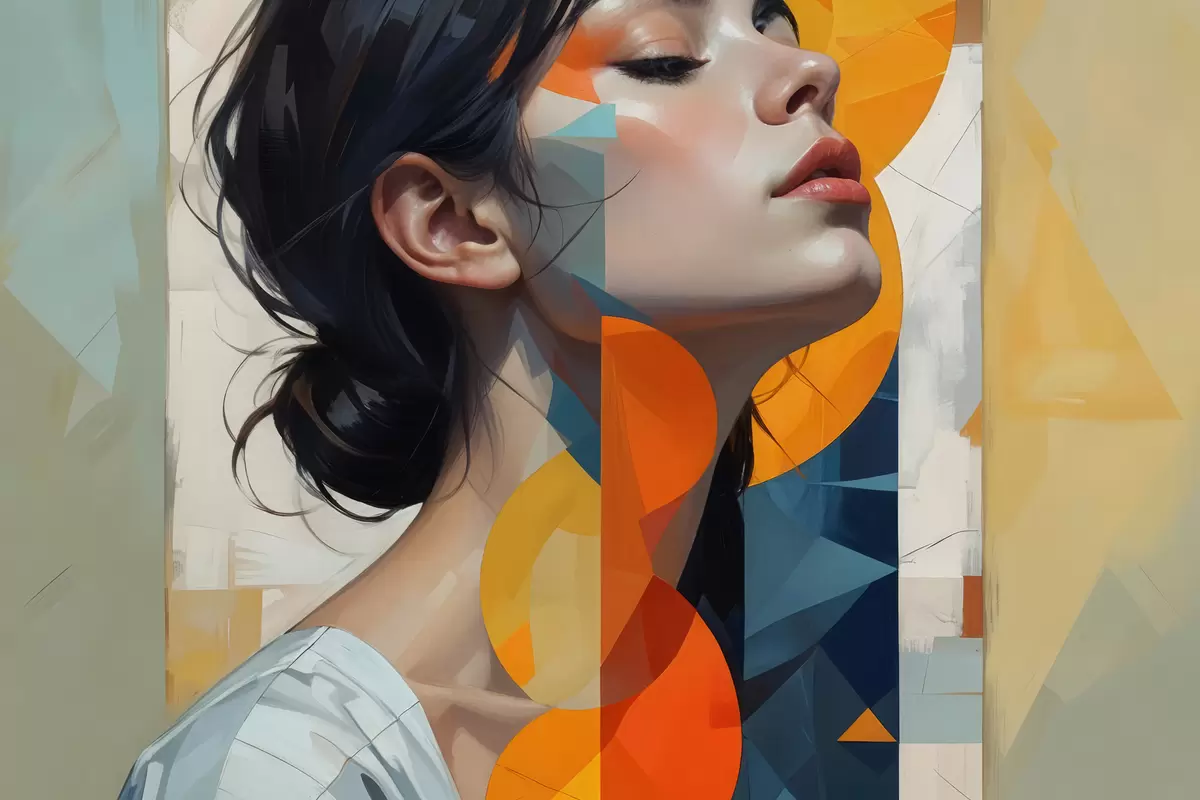 Glezna Abstrakta glezna, kurā attēlota sieviete ar gariem, tumšiem matiem, tērpta baltā kreklā ar krāsainu ģeometrisku apdruku s40543