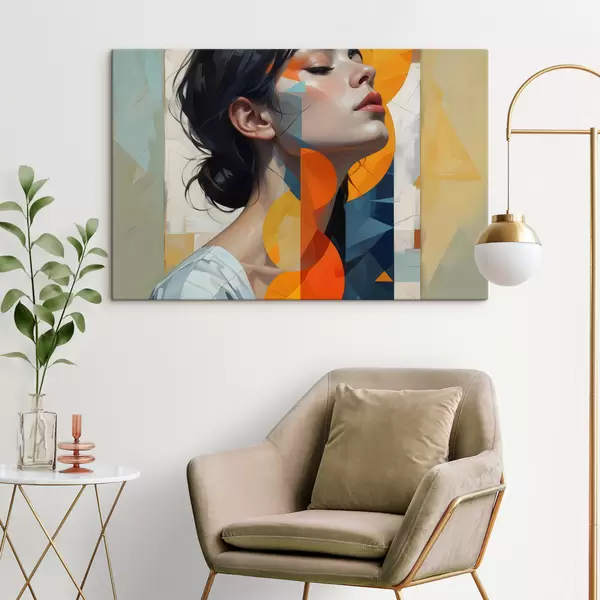 Glezna Abstrakta glezna, kurā attēlota sieviete ar gariem, tumšiem matiem, tērpta baltā kreklā ar krāsainu ģeometrisku apdruku Nr s40543