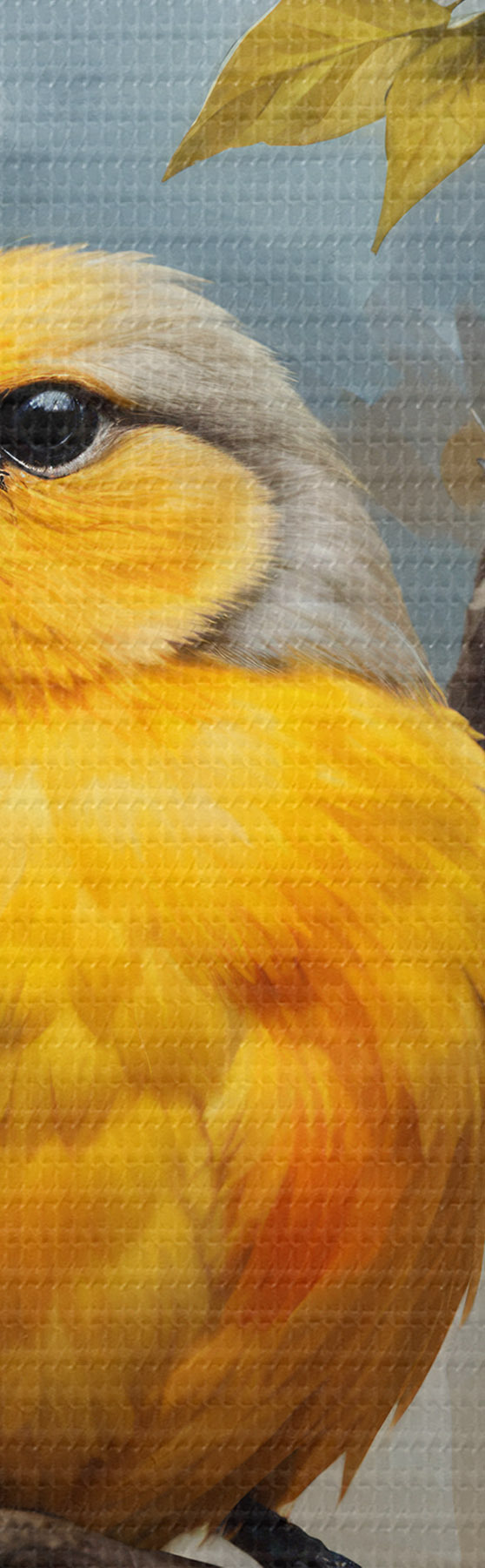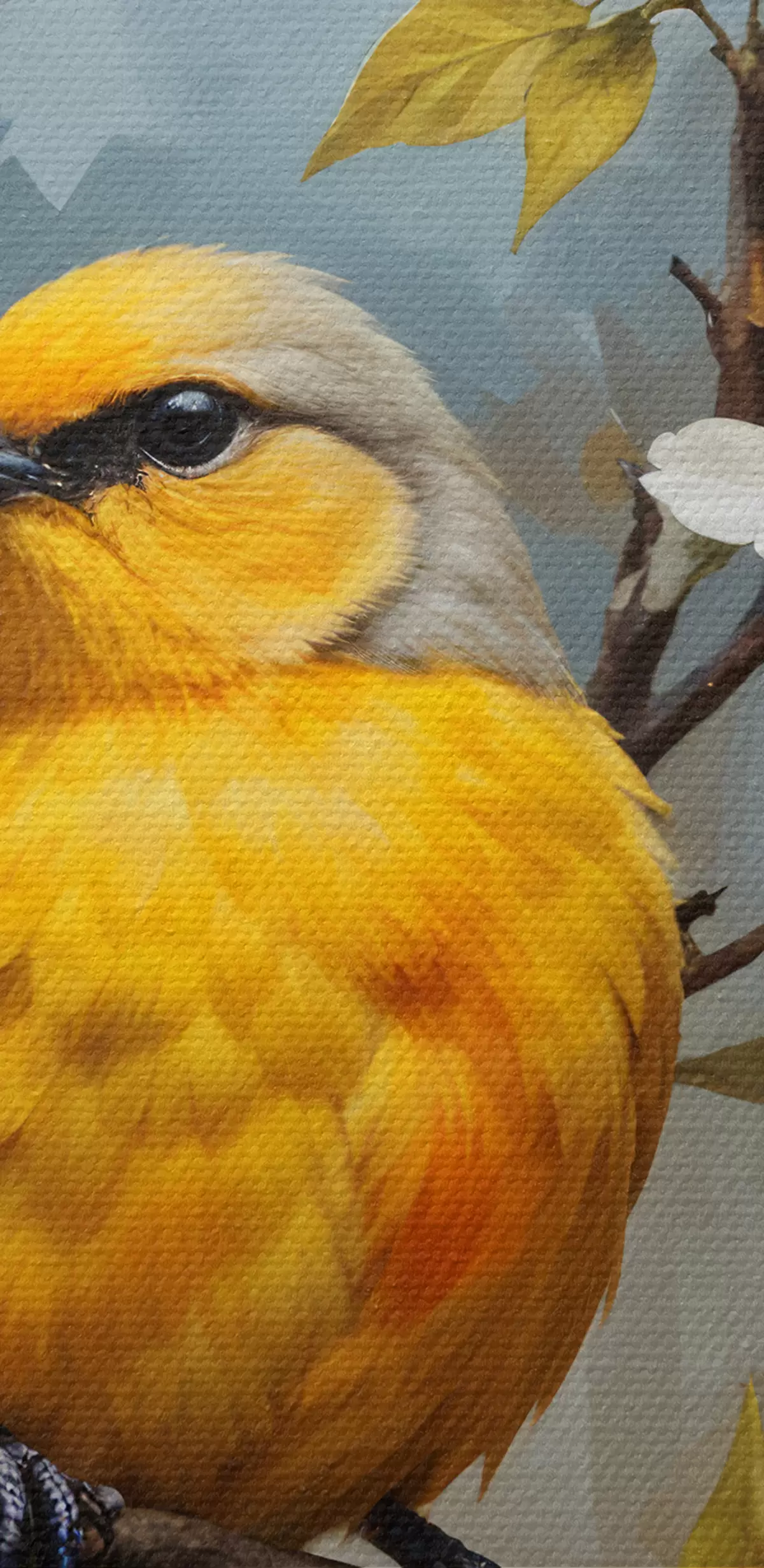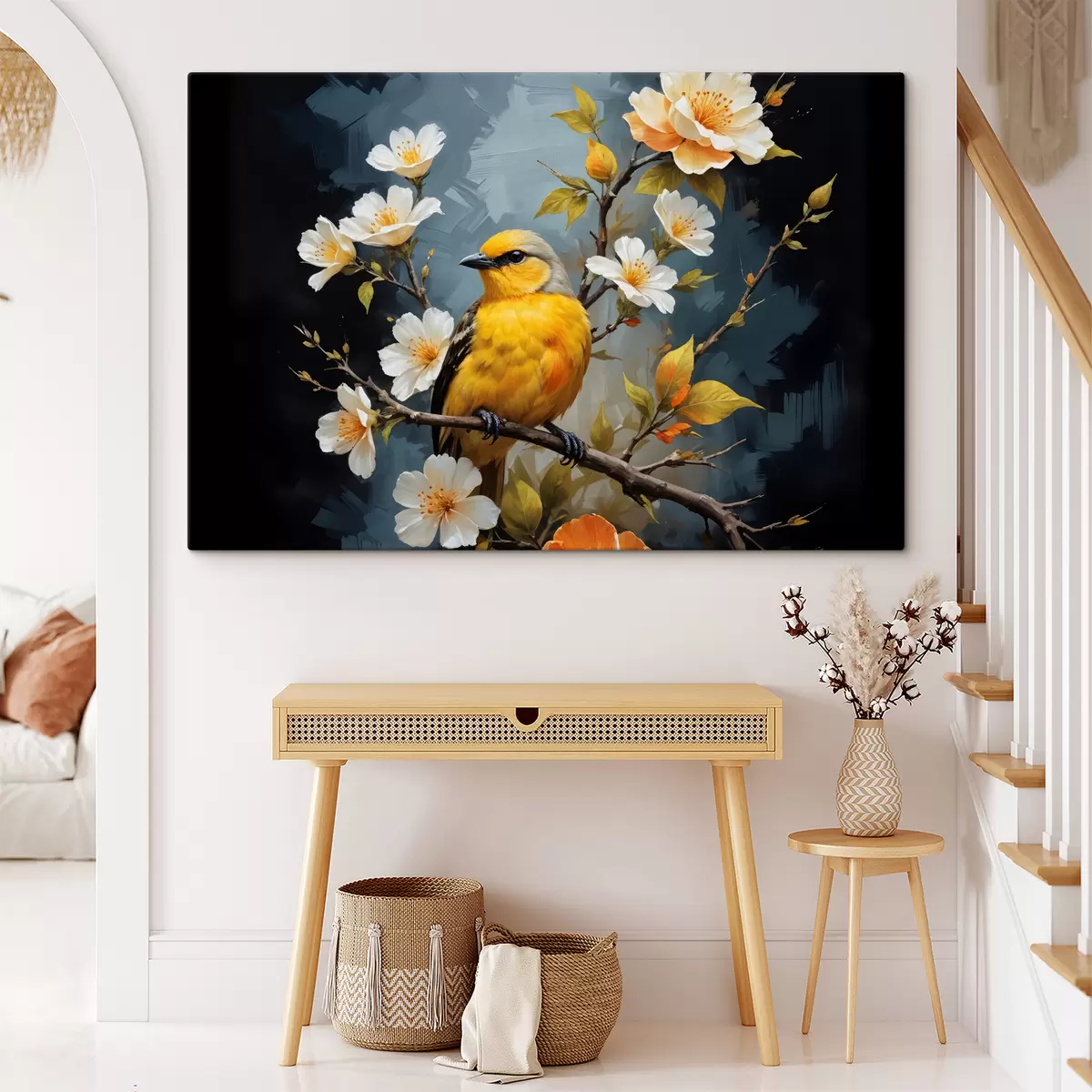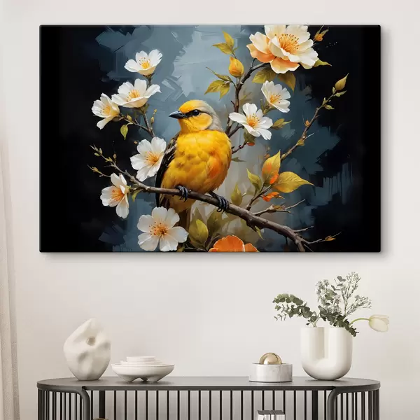 Glezna Dzeltens putns, kas sēdējis uz zara ar baltiem un oranžiem ziediem fonā Nr s40550