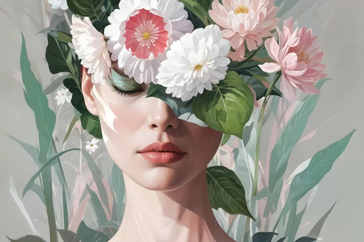 Glezna Sieviete, kuru daļēji aizsedz lielu rozā un baltu ziedu pušķis uz zaļa, lapu fona s40567