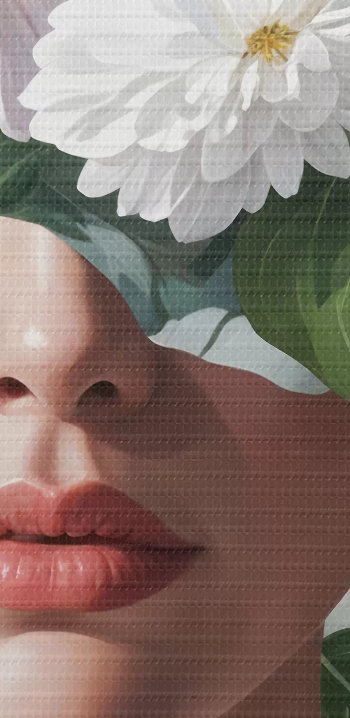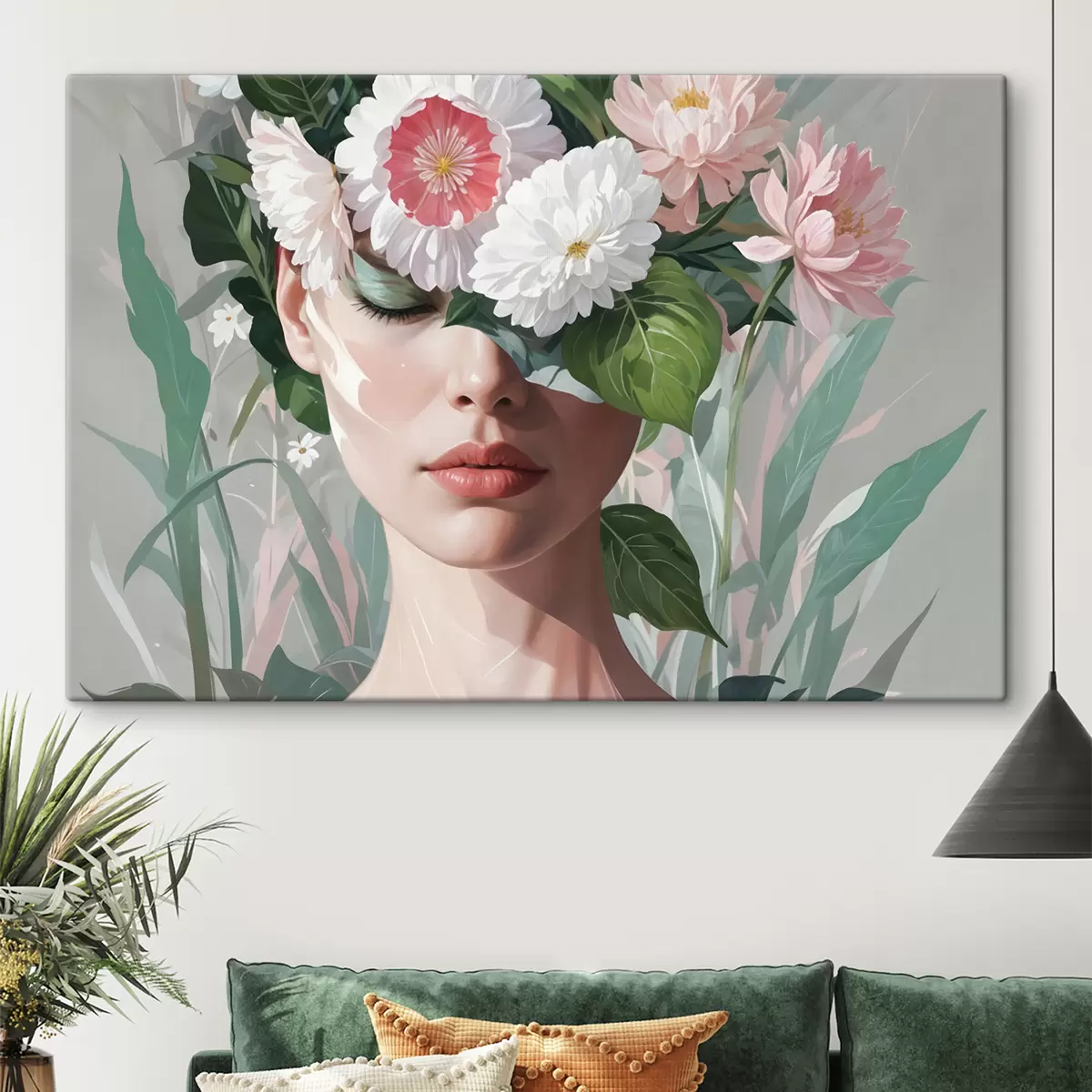 Glezna Sieviete, kuru daļēji aizsedz lielu rozā un baltu ziedu pušķis uz zaļa, lapu fona Nr s40567
