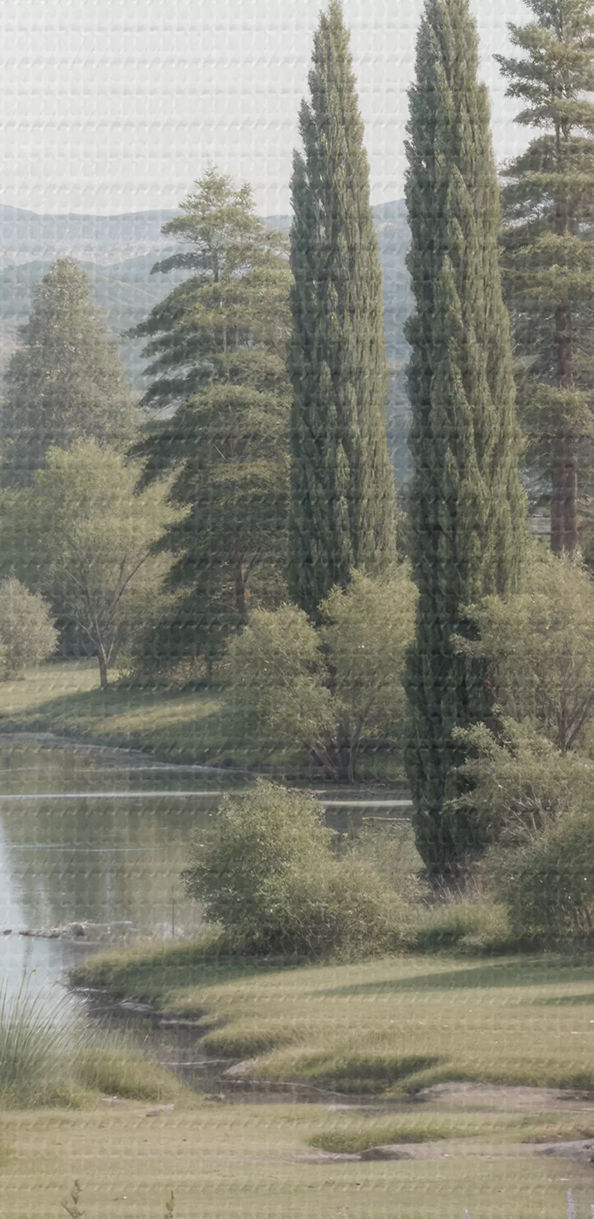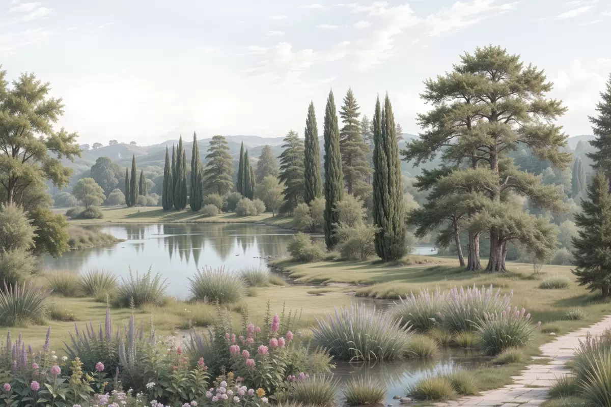 Glezna Rāma ainava ar rāmu ezeru, ko ieskauj priedes, cipreses un cita lekna veģetācija Nr s40579