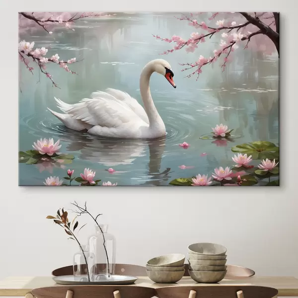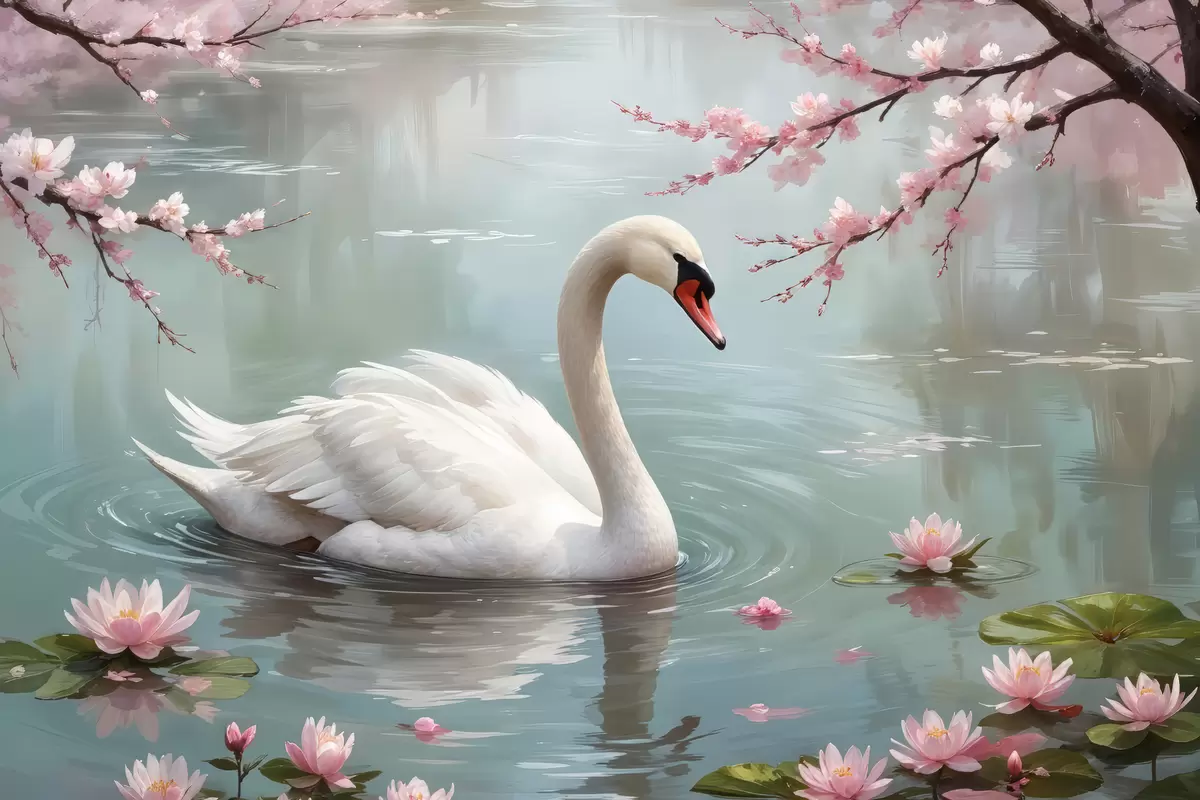 Glezna Graciozs balts gulbis peld mierīgā dīķī, ko ieskauj ziedoši rozā ķiršu koki Nr s40597