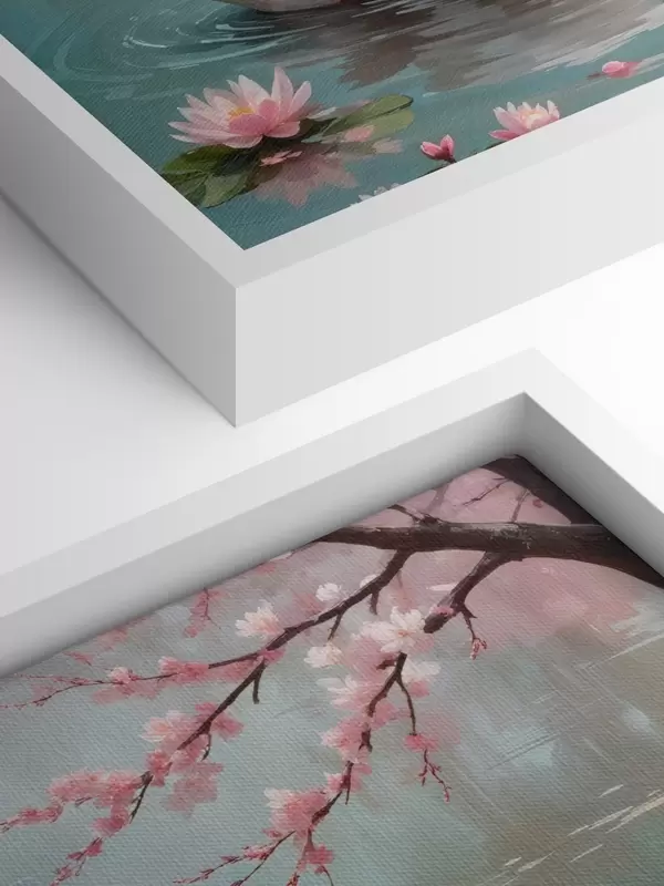 Glezna Graciozs balts gulbis peld mierīgā dīķī, ko ieskauj ziedoši rozā ķiršu koki s40597