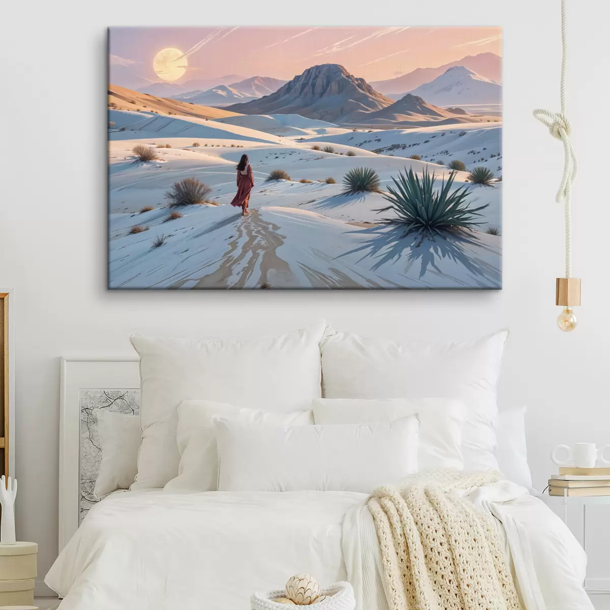 Glezna Sieviete sarkanā kleitā tuksneša ainavā ar kalnu fonā un smilšu kāpām Nr s40603