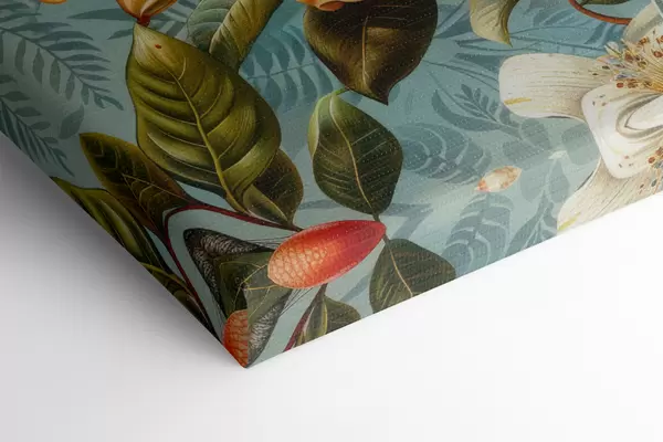 Glezna Tropu kompozīcija ar dažādiem zaļumiem un tropu ziediem uz zila fona s40665