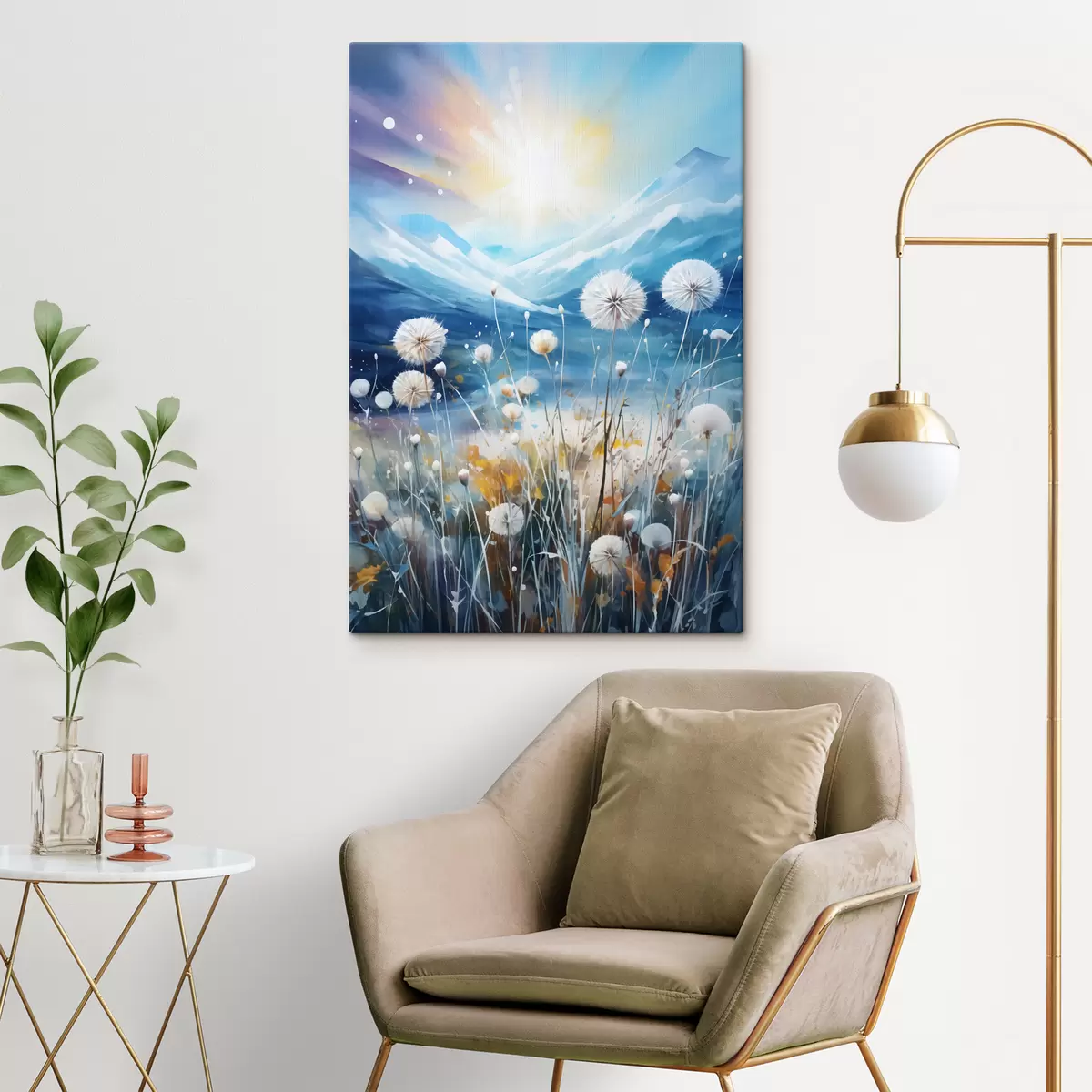 Glezna Saules apspīdēti kalni un pienenes ziedi s40720