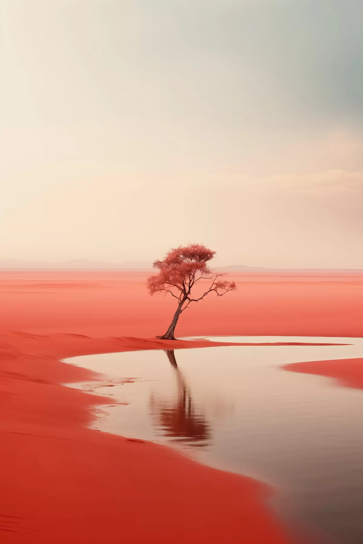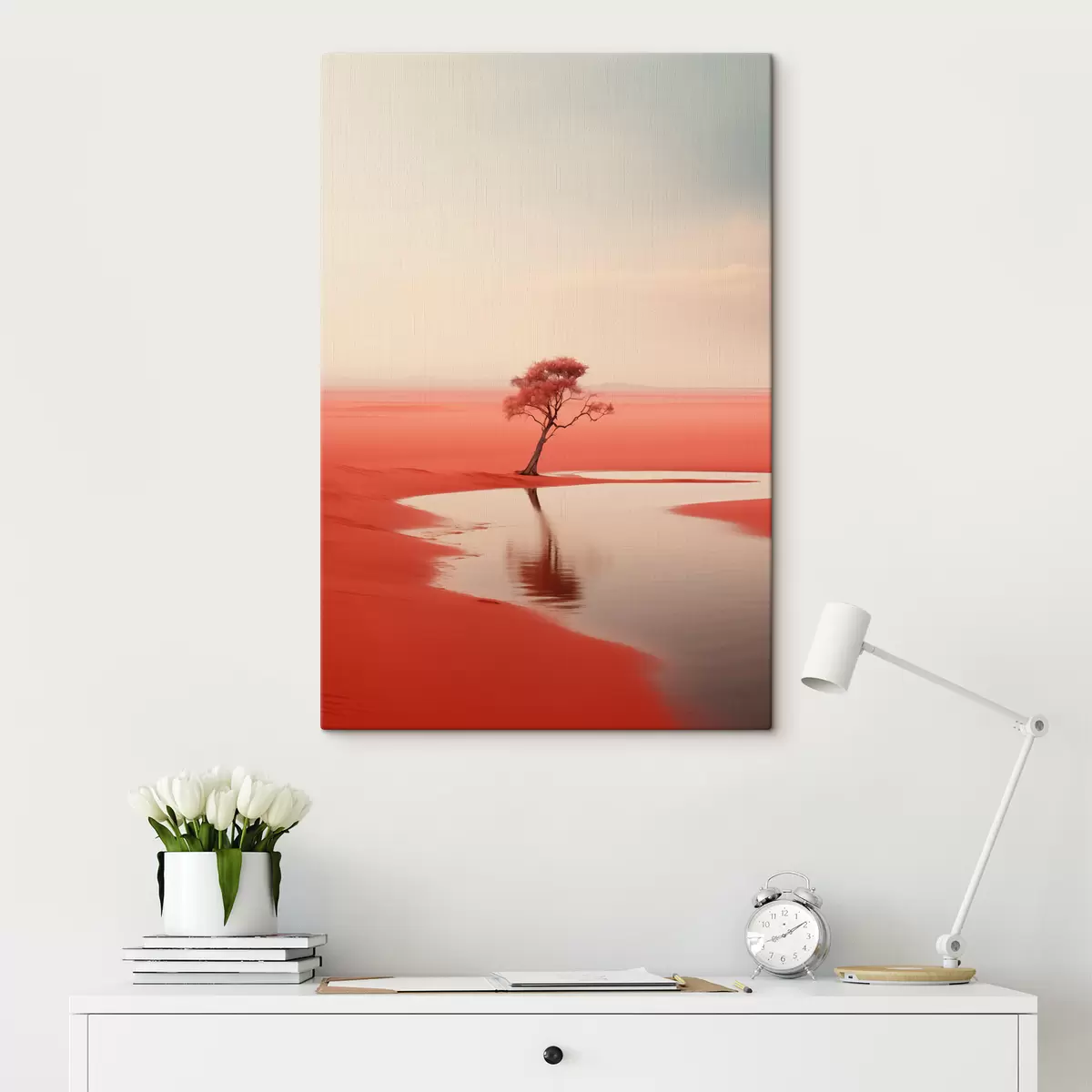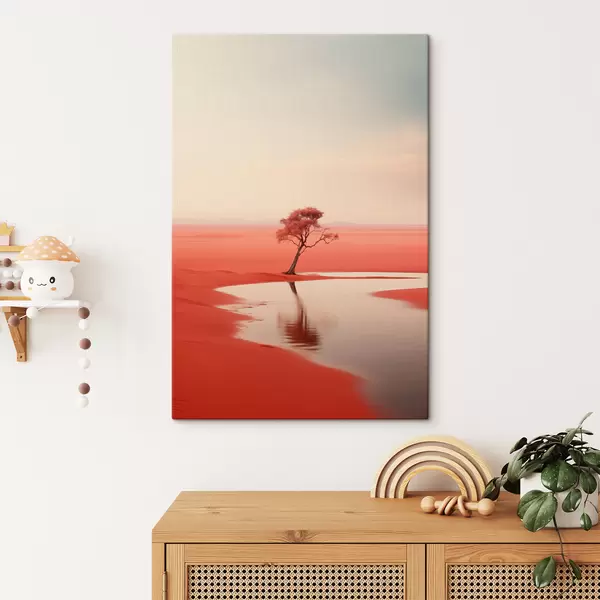 Glezna Minimālistisks ainavas koks pie upes, sarkana, pelēka krāsa s40722