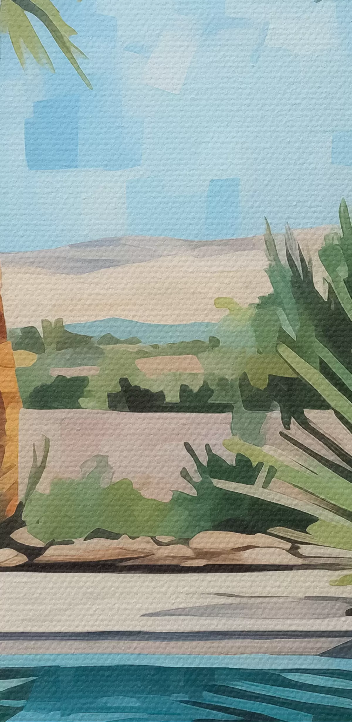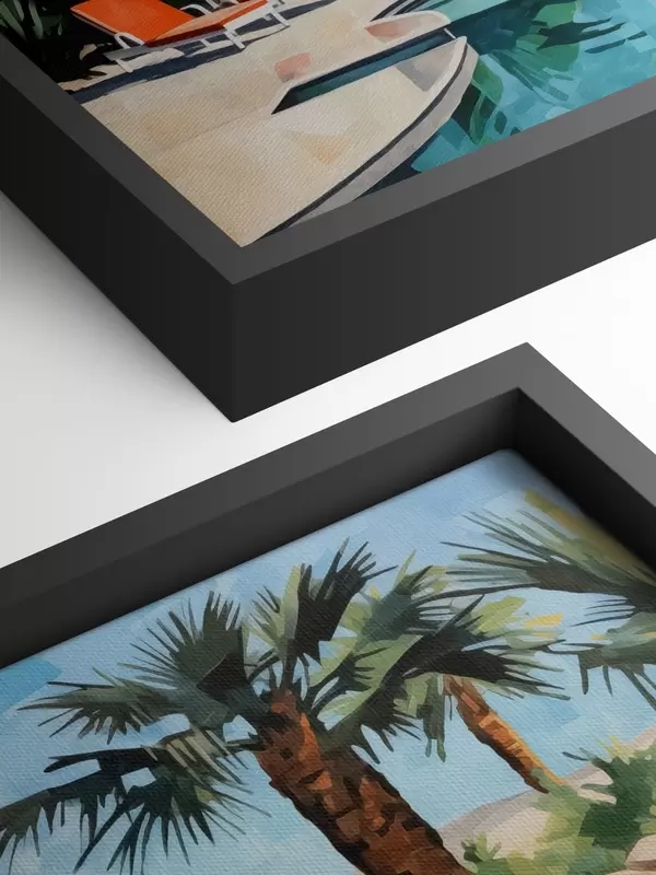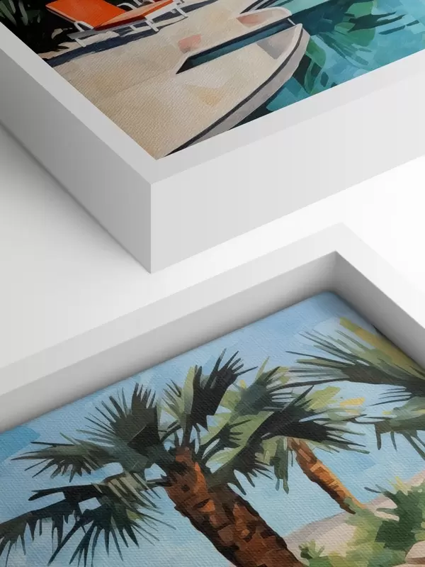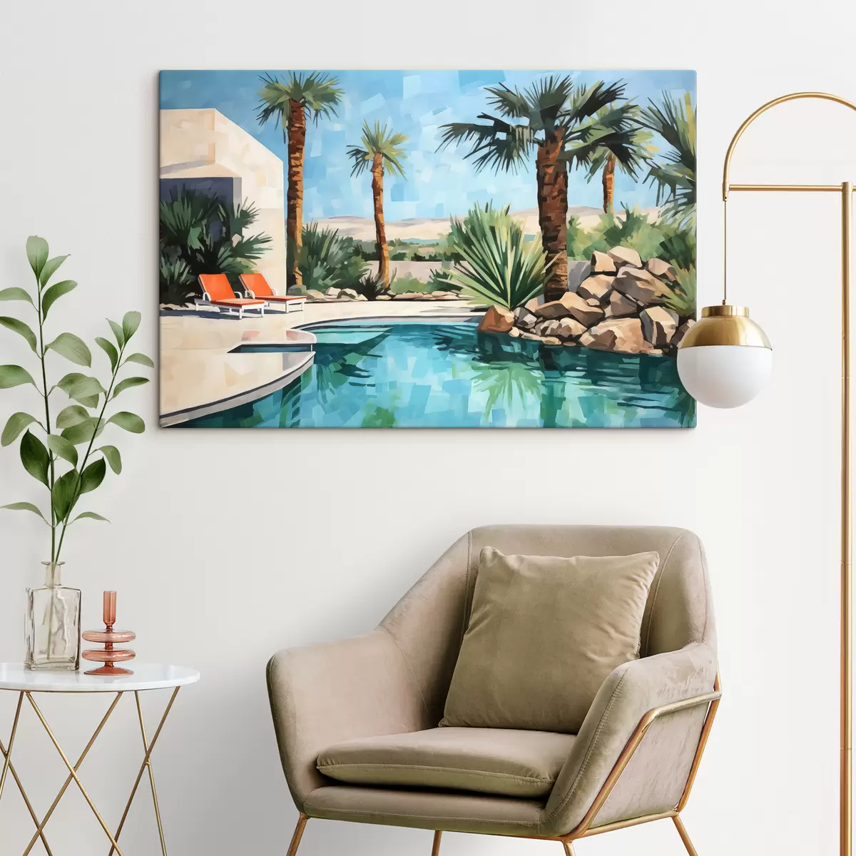 Glezna Palmas pie viesnīcas ar baseinu pie klintīm, zilā, zaļā, sarkanā krāsā s40748