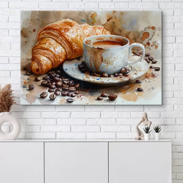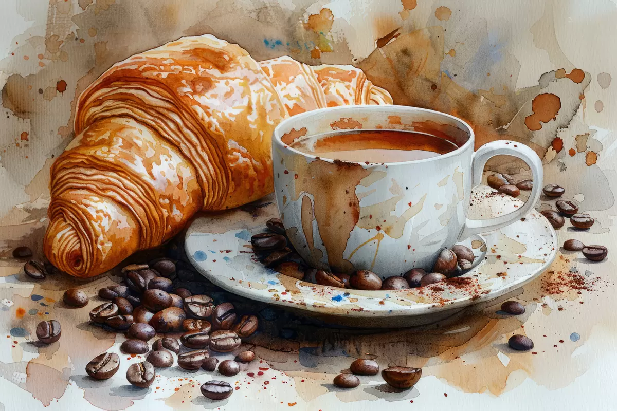 Glezna Kruasāns, rīts, kruasāns un kafijas tasīte, akvarelis s40782