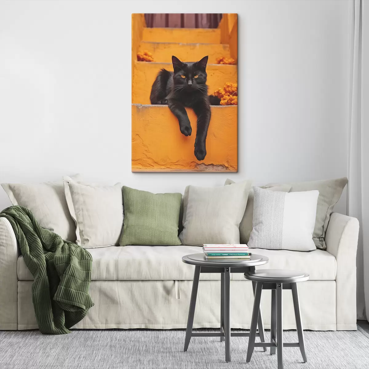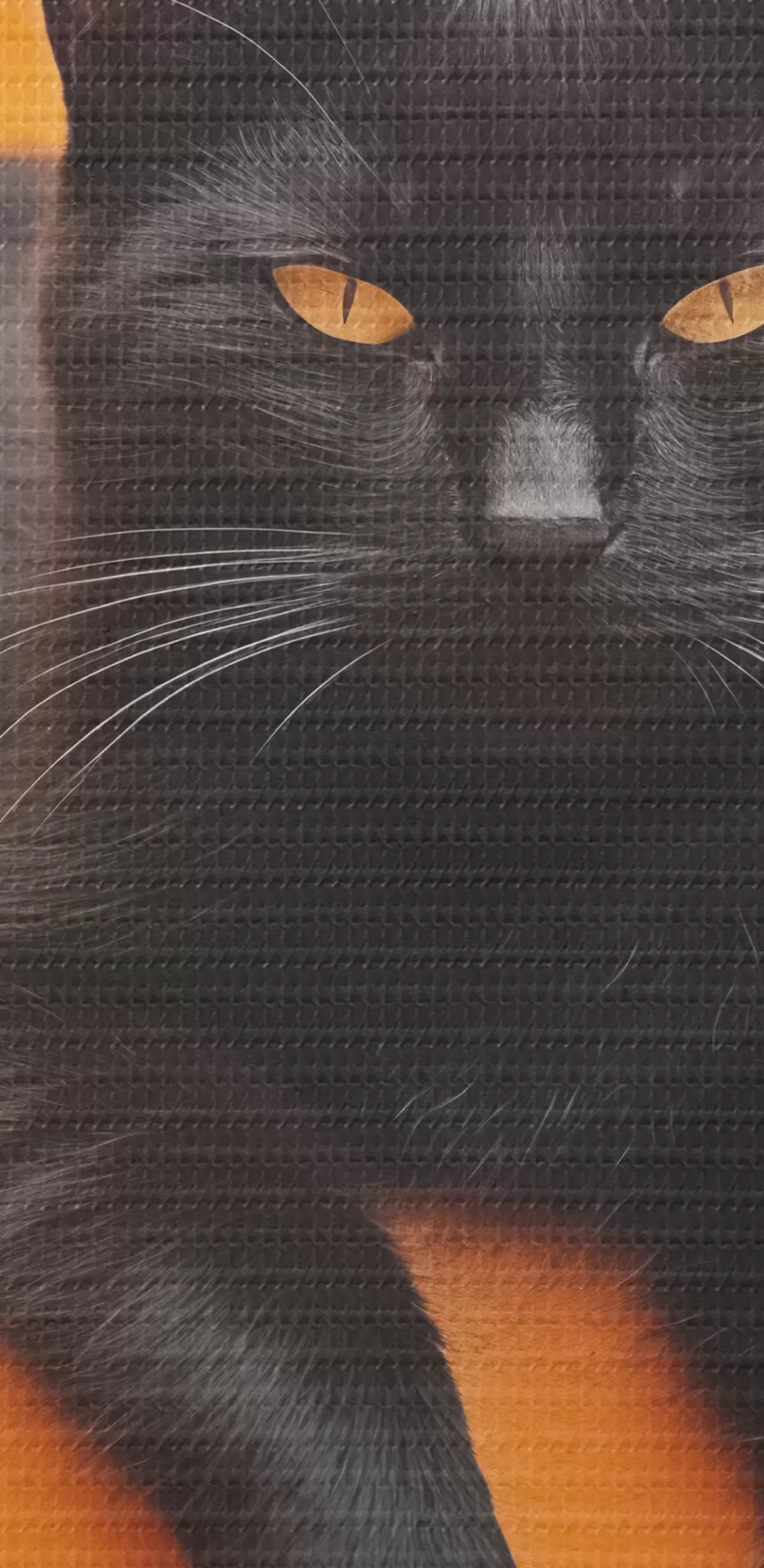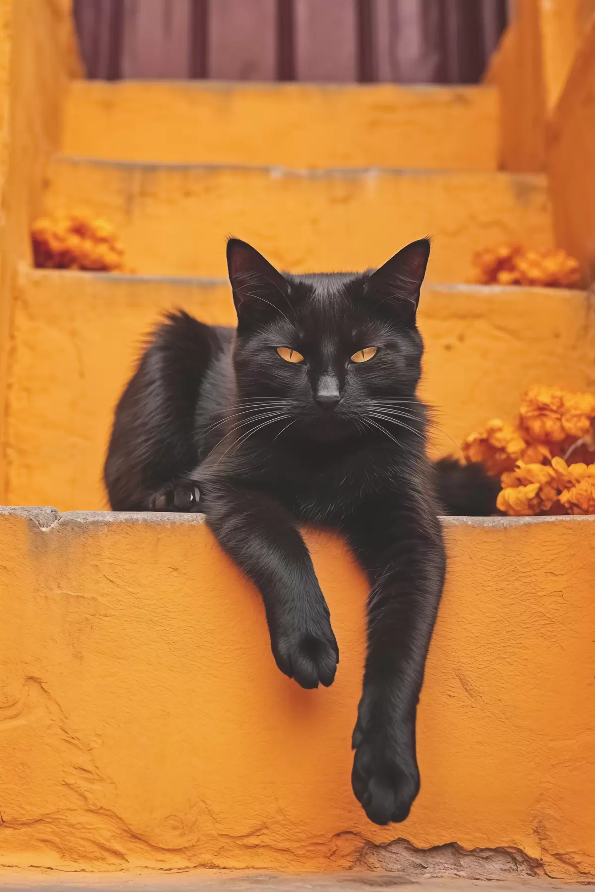Glezna Melns kaķis guļ uz dzelteniem pakāpieniem Nr s40798