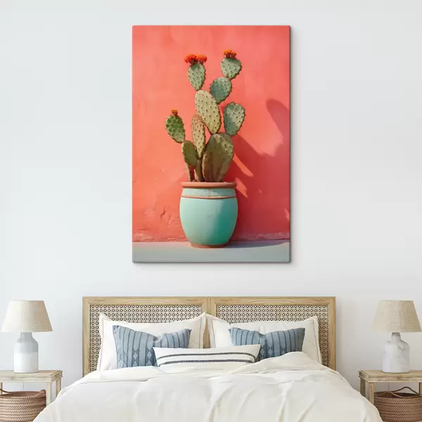 Glezna Kaktuss gaišā podā uz rozā sarkanas sienas fona s40800
