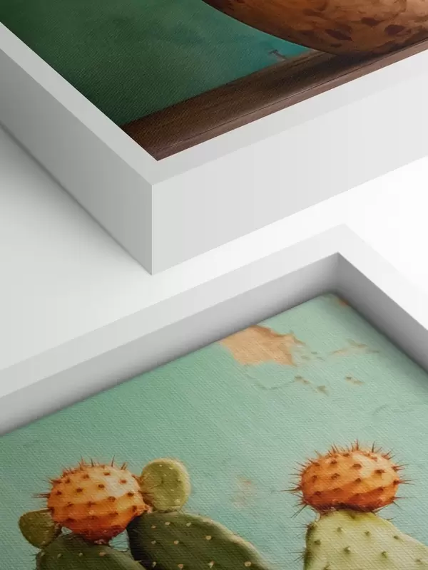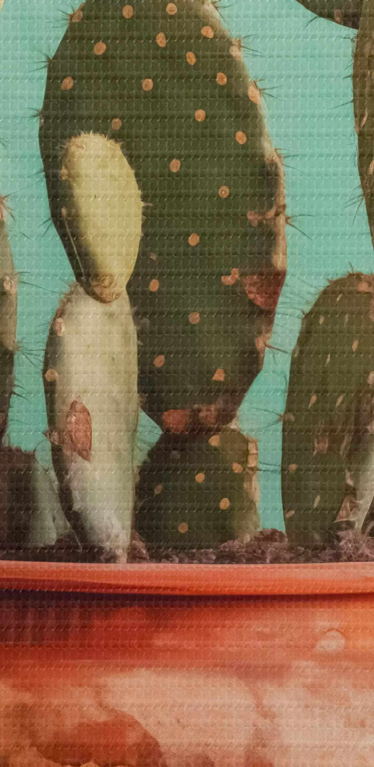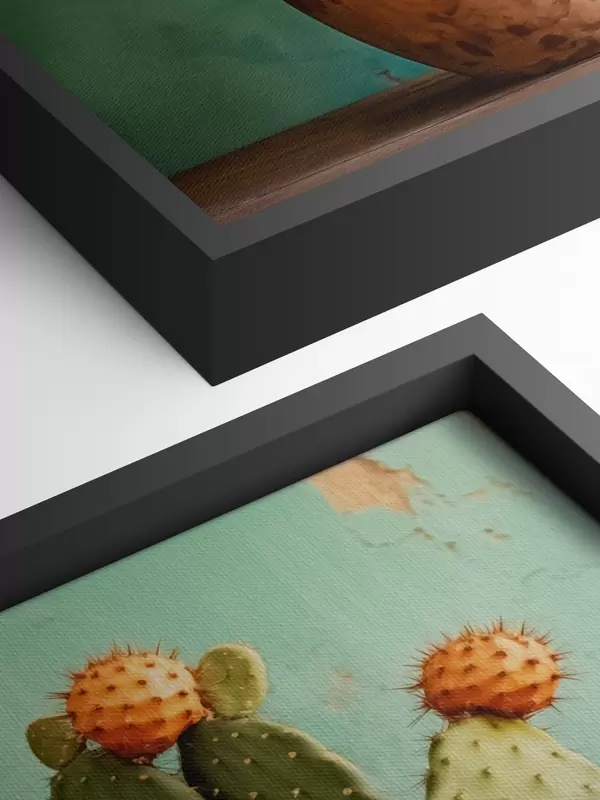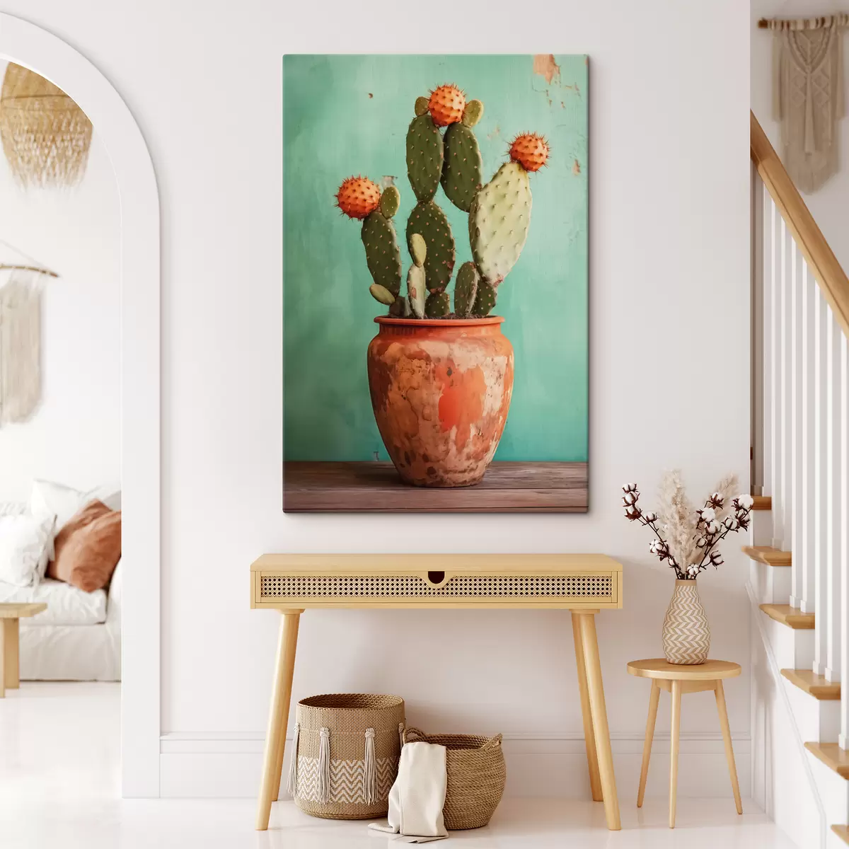 Glezna Kaktuss vecā māla podā uz zilganzaļas sienas fona s40807